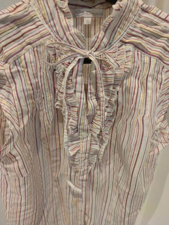 Chemise sans manche rayée rose/marine/moutarde, taille 36, en très bon état, peu porté, fermeture par boutons et par un lien