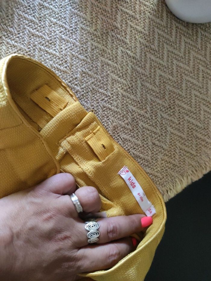Jupe couleur moutarde, taille 3 ans, en très bon état, peu porté, réglable à la taille à l'intérieur par élastique, tirette à l'arrière,. petite poches décoratives à l'avant
