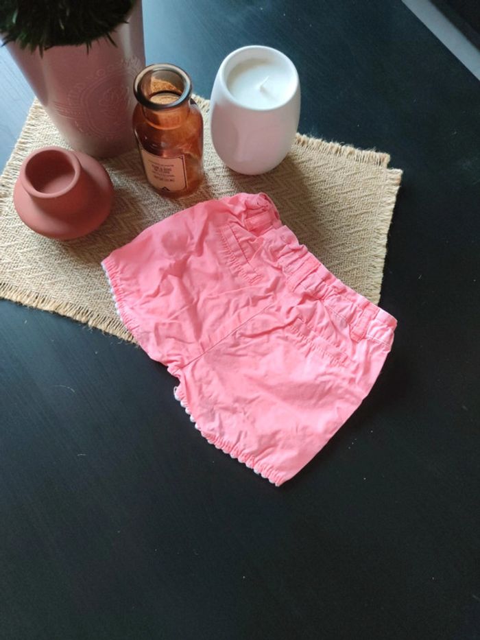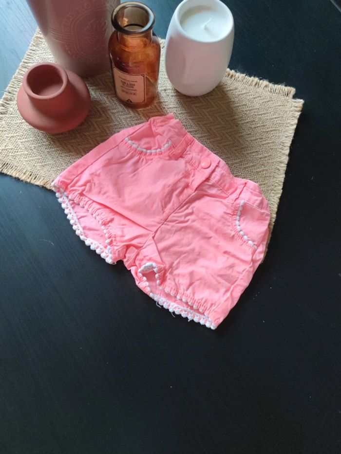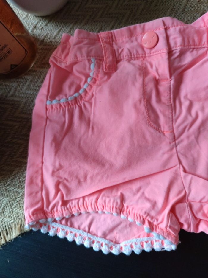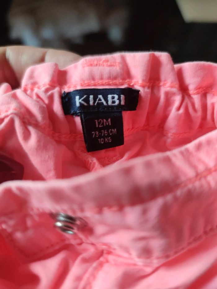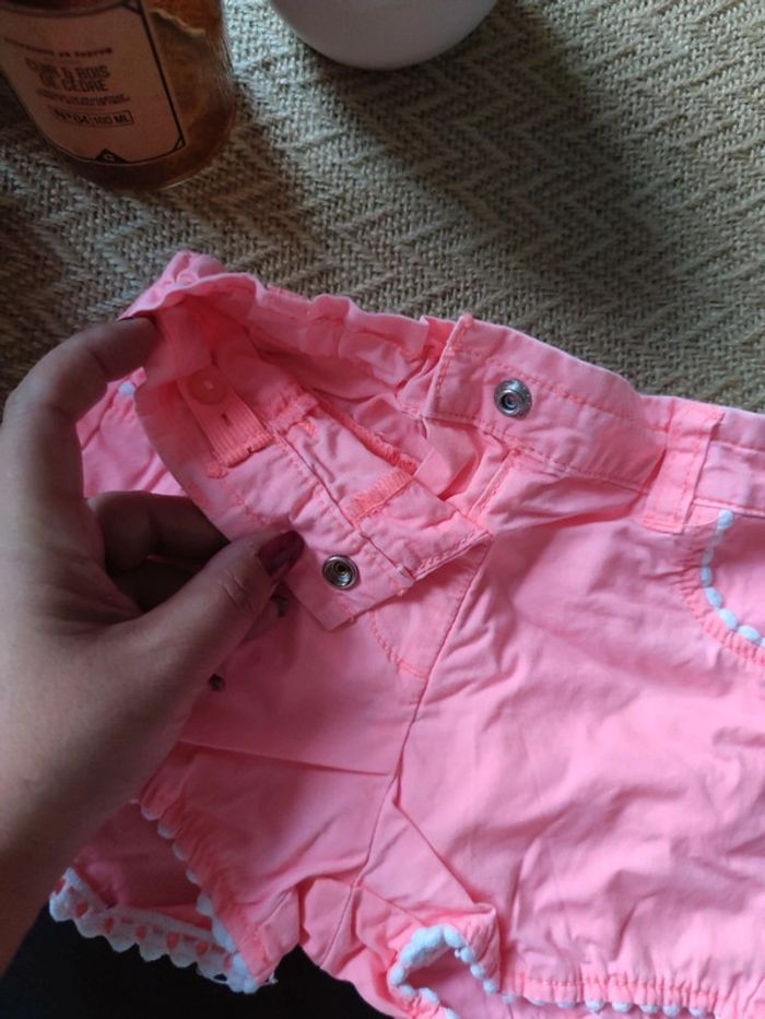 Short léger corail fluo, taille 12 mois, en très bon état, légèrement délavé, réglable à l'intérieur par élastique, fermeture par bouton pression, poches décoratives à l'avant et à l'arrière, passant ceinture