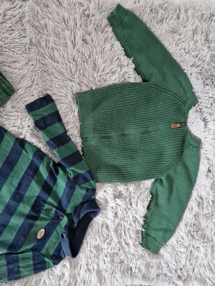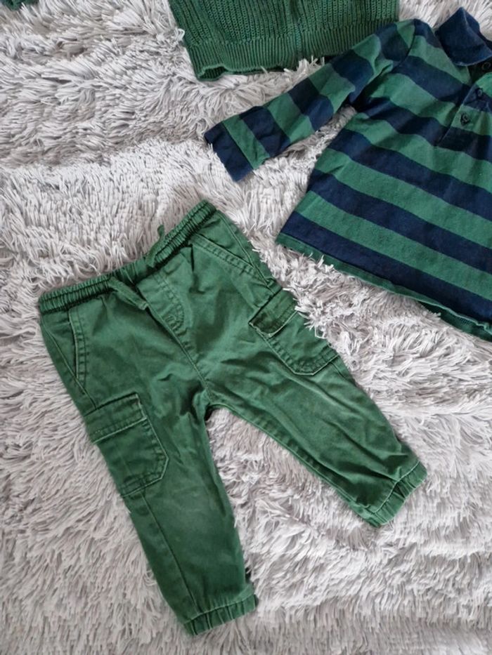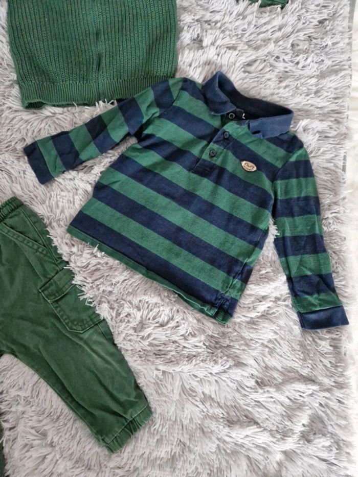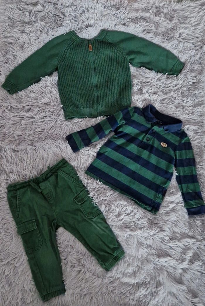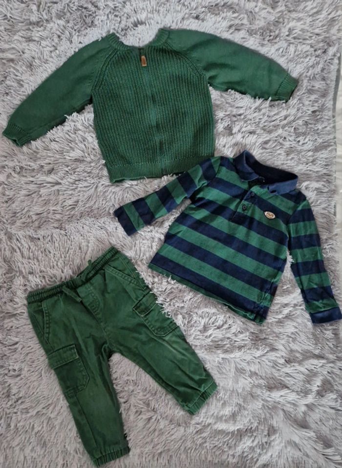 Lot 18 mois comprenant : 1 gilet 100% coton marque Tape à l'œil 1 polo manches longues 100% coton marque kiabi 1 pantalon 100% coton marque kiabi Possible à l'unité.