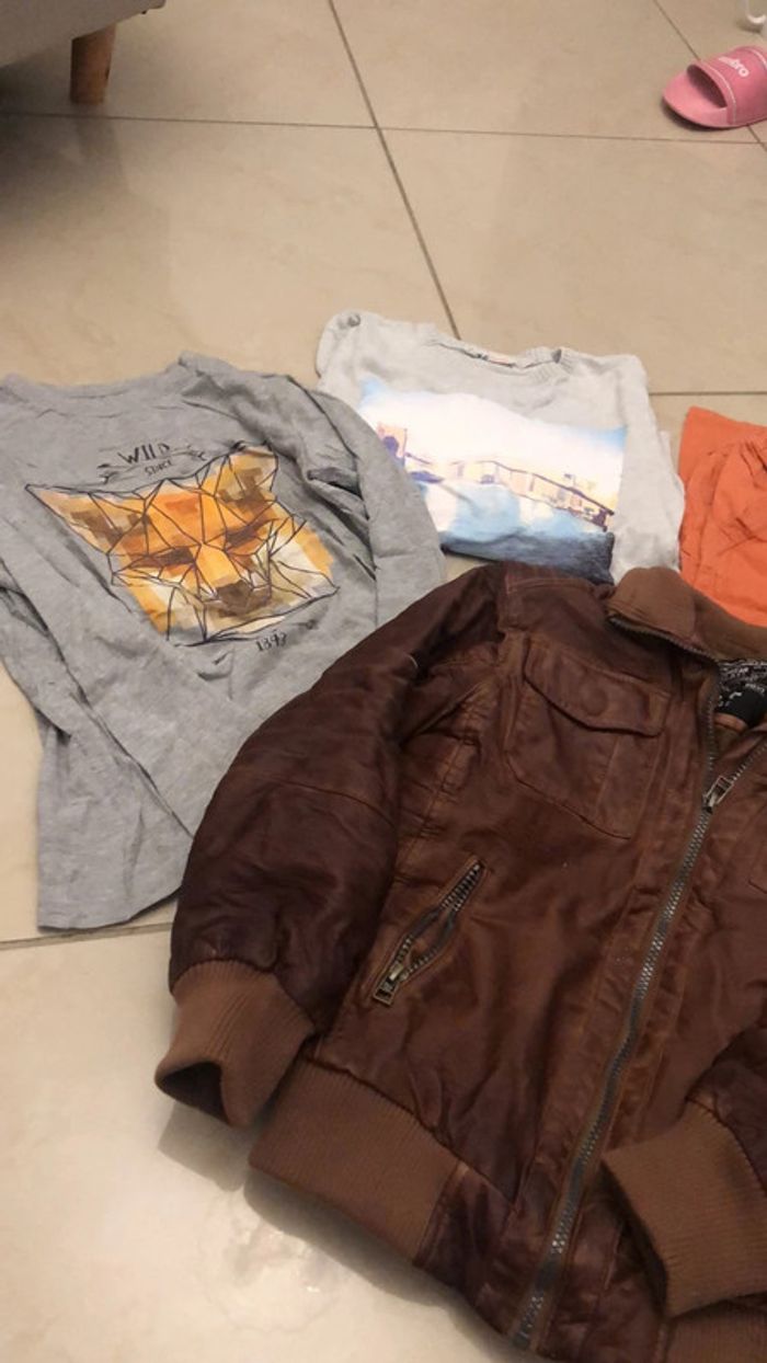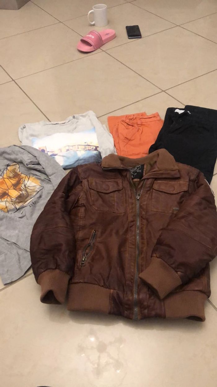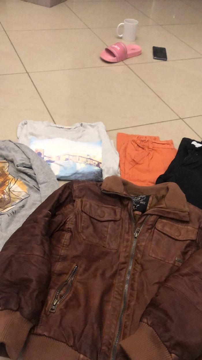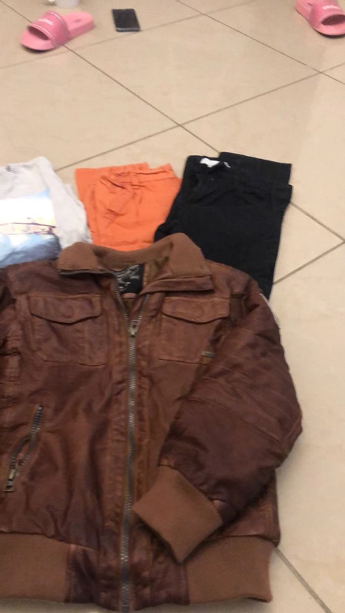 Veste avec petits accros CF photo denimwear T-shirt manches longues Kiabi Pull H&M Pantalon orange là Halle Pantalon noir rayé gris clairs la hall
