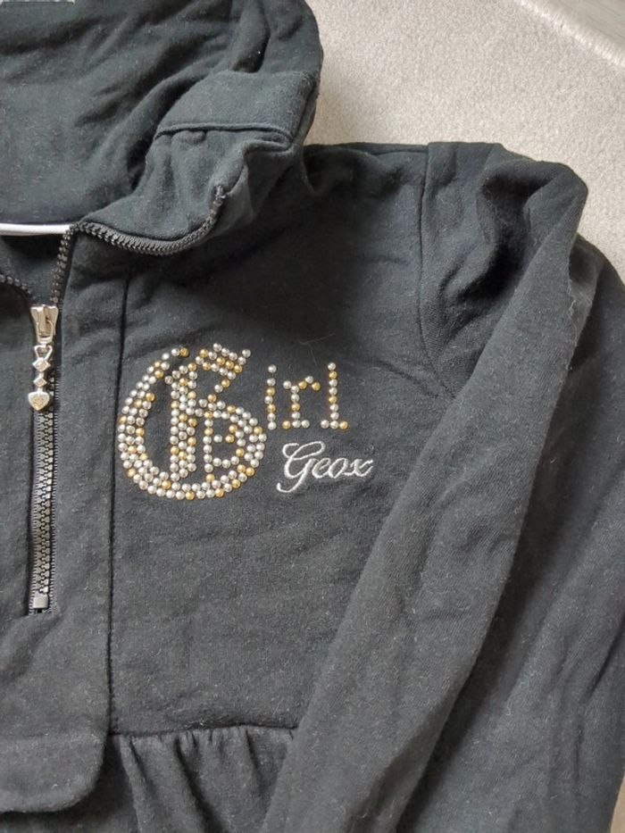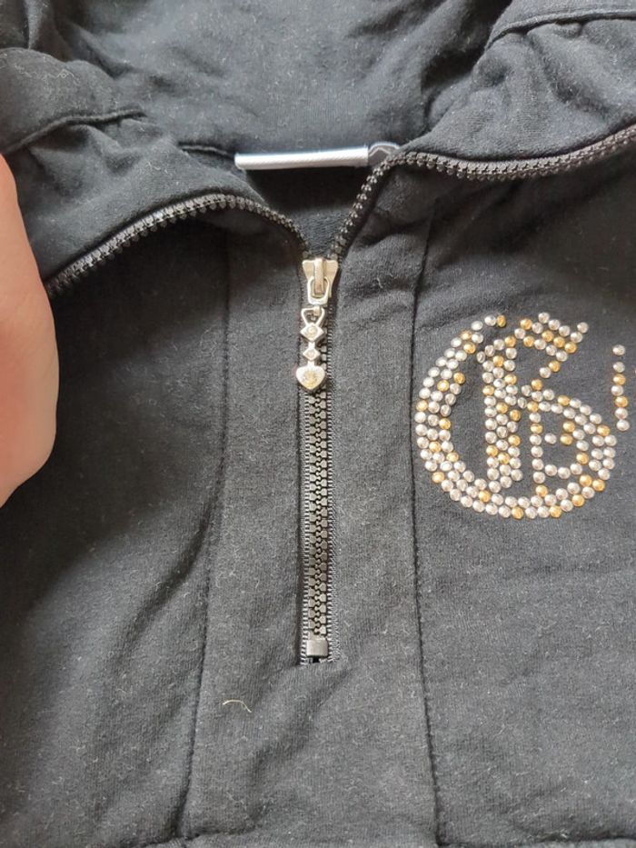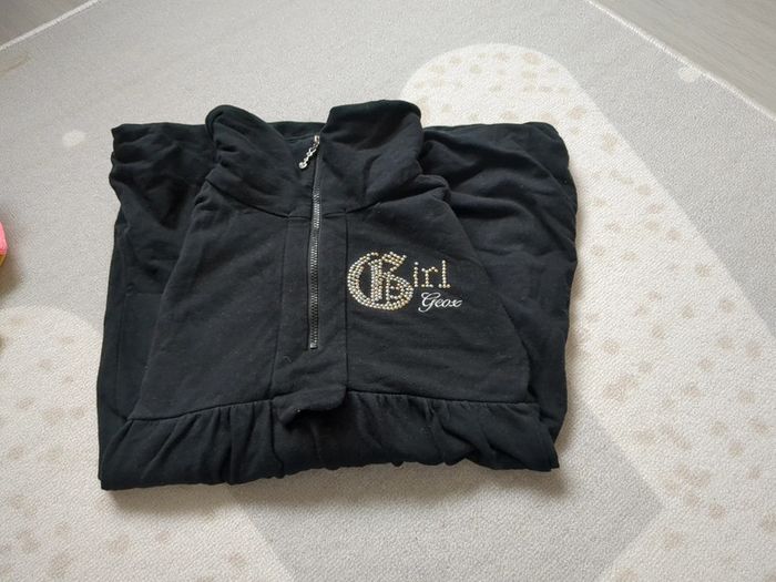 Très bon état - noire avec 2 poches sur le devant, un zip pour ouvrir le col et un motif avec strass - léger effet boule en bas de la robe