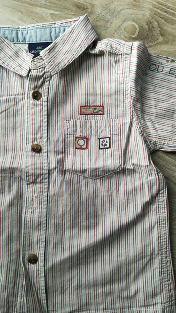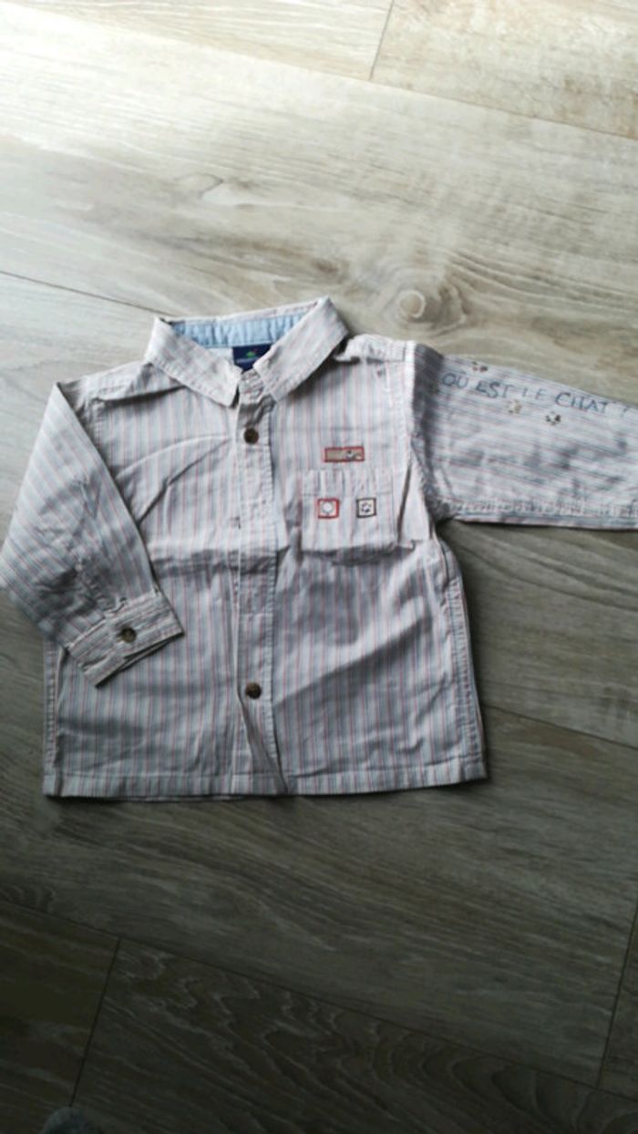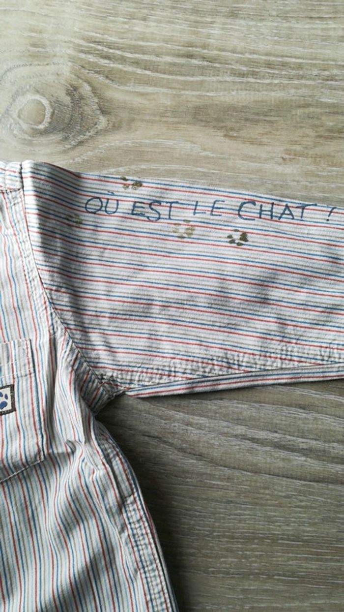 Jolie chemise manches longues à rayures bleu, rouge, beige et inscription "où est le chat" #pegouille_douzemois