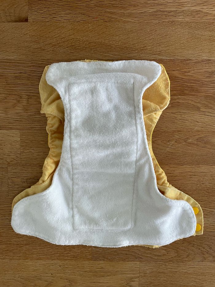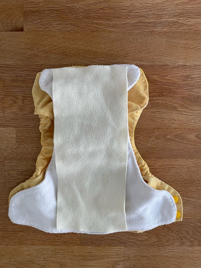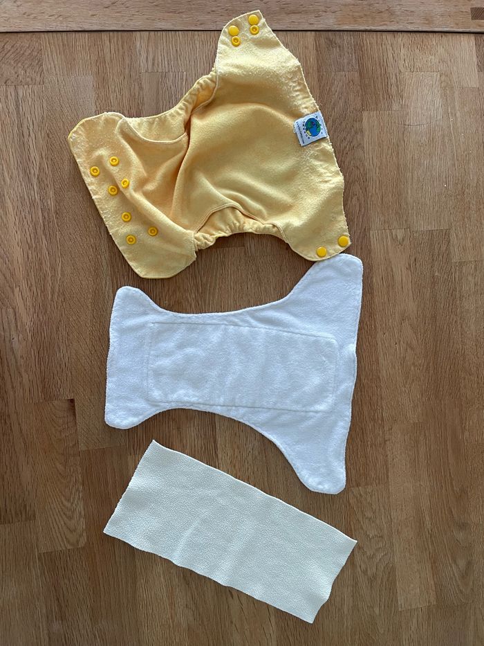 Couche lavable superposable en 3 parties : une couche imperméable jaune / une couche absorbante / un voile polaire effet au sec Convient pour les nourrissons jusqu’à 4kg environ.