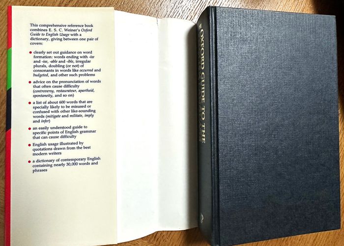 Cartonné avec jaquette, 577 pages, 822 gr Texte en anglais. livre de grammaire anglaise en anglais avec la formation des mots, leur prononciation. C'est le manuel idéal pour tous ceux qui se soucient du bon usage de la langue anglaise. Combinant l'Oxford Guide to English Usage et un dictionnaire Oxford compact, ce volume est complet et exceptionnellement pratique pour une consultation régulière. This is the ideal handbook for everyone who cares about the proper use of the English language. Combining the Oxford Guide to English Usage and a compact Oxford dictionary, this volume is comprehensive and exceptionally convenient for regular consultation.