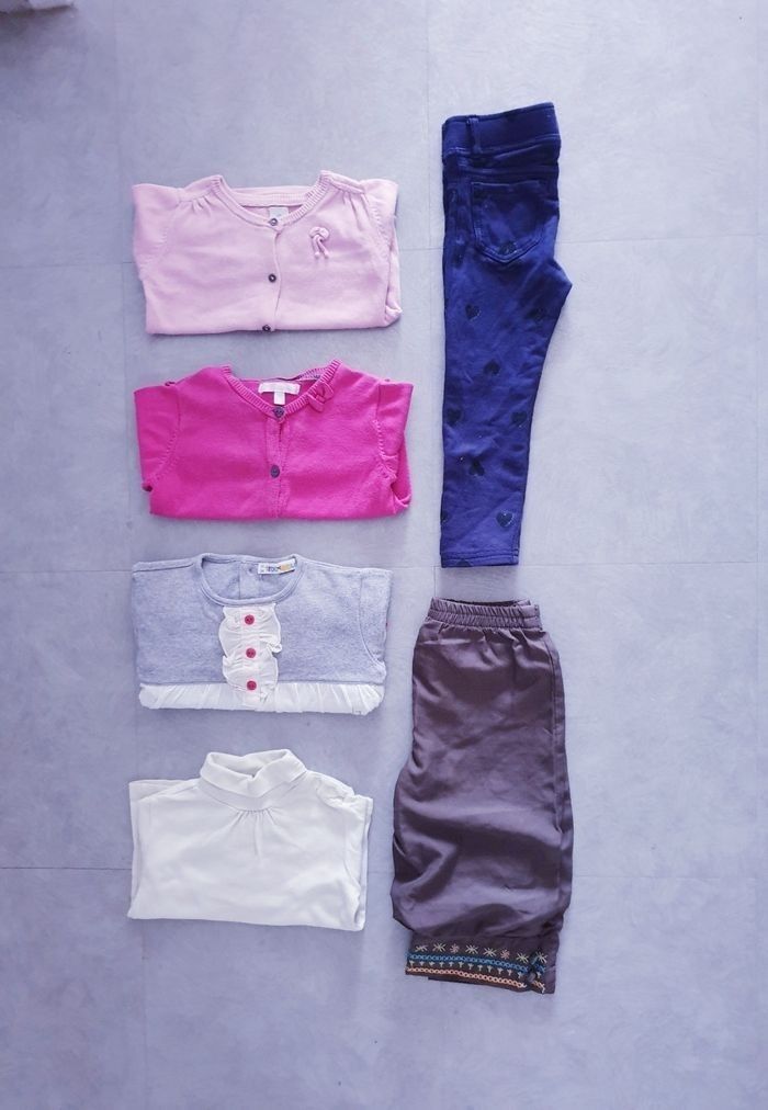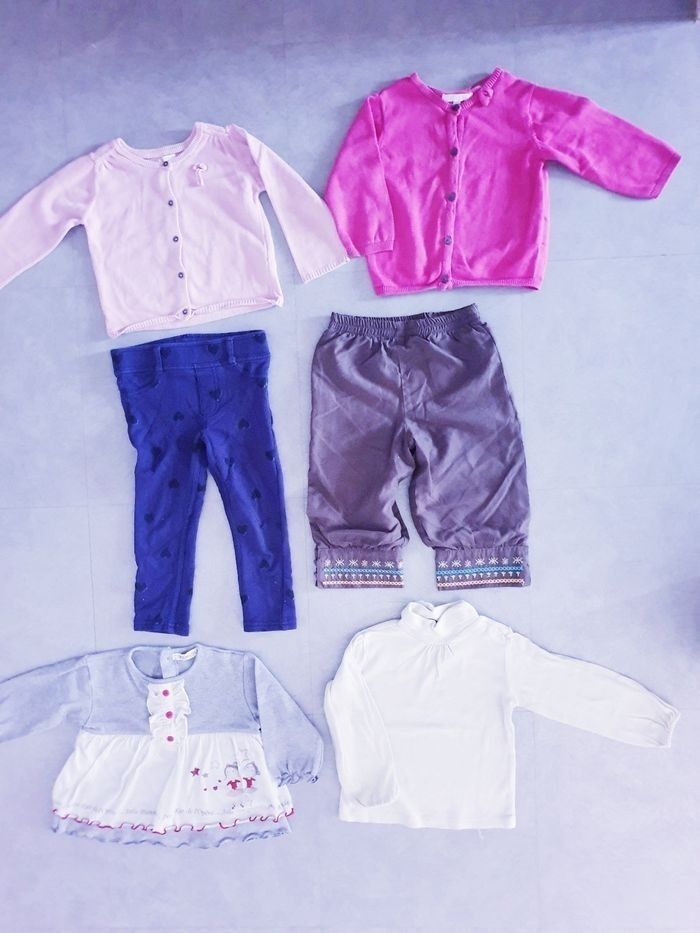 Lot taille 18mois, 2 pantalons, 2 gilets, un haut et un tshirt col roulé. Bon état général a part le jegging qui a un accro recousu au genou. Prix sur lot dans mon dressing #pantalon #legging #jegging #gilet #pull #tshirt #hetm #kiabi