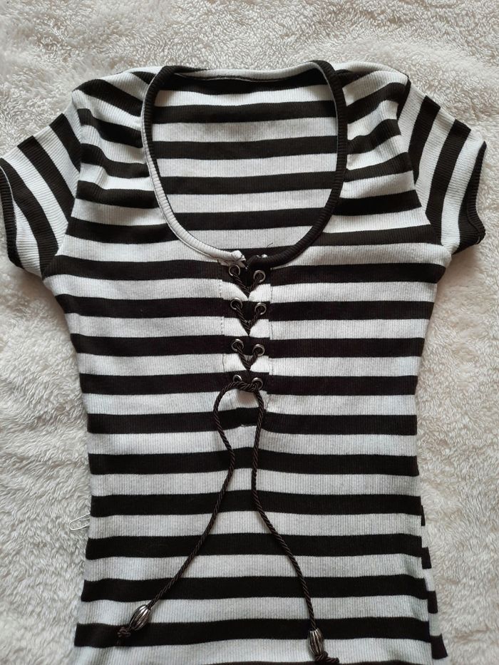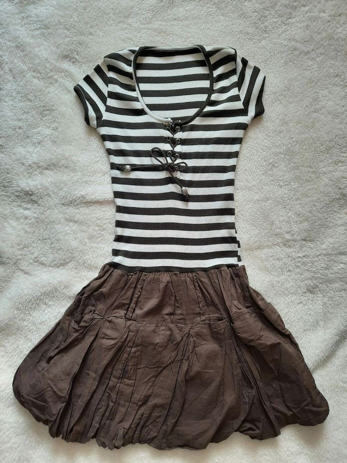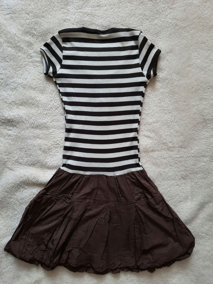 Jolie petite robe, haut à rayures avec 5% d'élasthanne ainsi q'un bas original jupe bouffante😊 Peur convenir por un enfant de 14 ans suivant les mensurations🙂