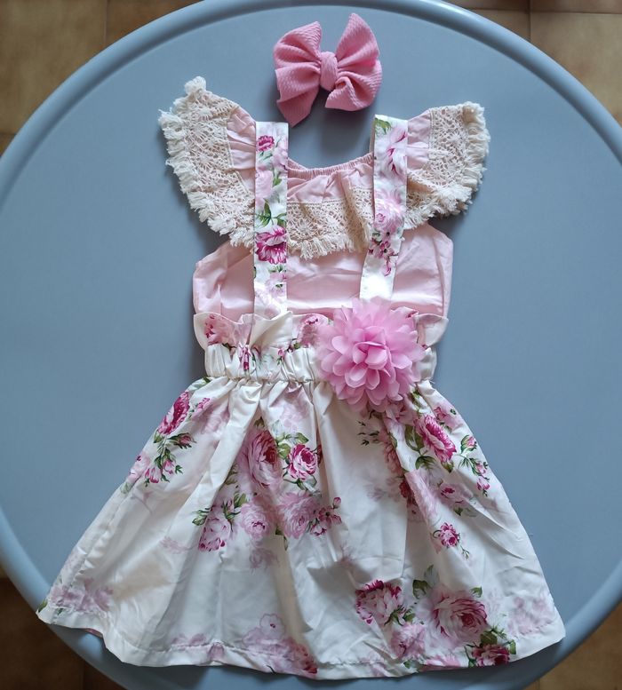 Ensemble neuf blouse, robe à bretelles réglables et grosse fleur à la taille, barrette gros noeud