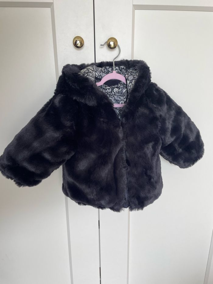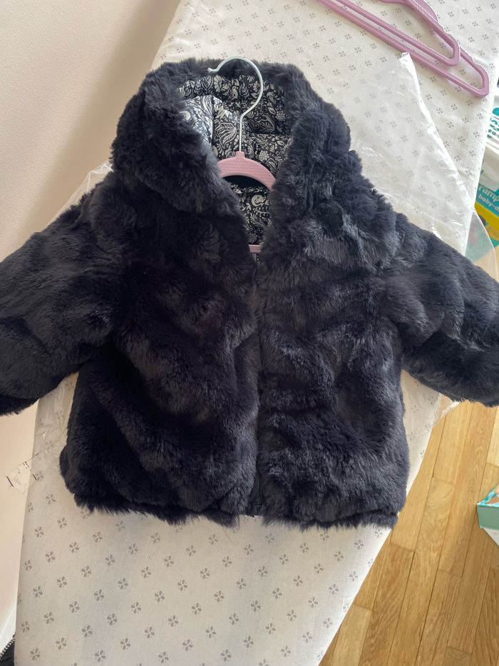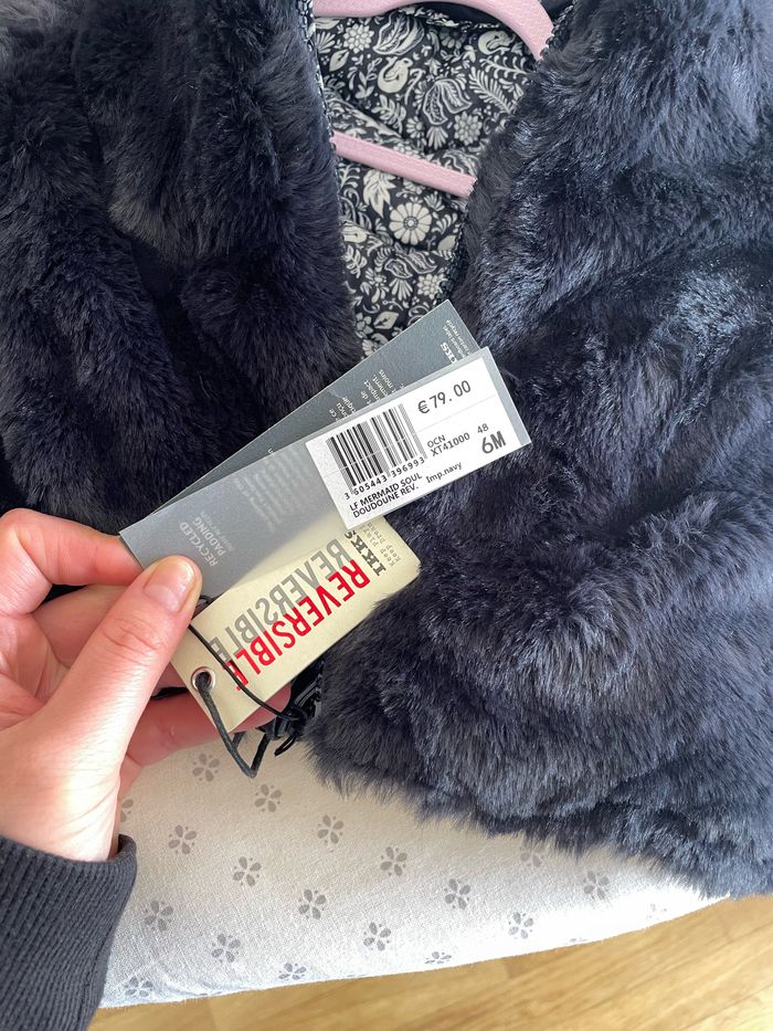 Jolie doudoune IKKS taille 6 mois bébé fille D’un côté imitation fourrure bleu marine / de l’autre côté imperméable motif tattoo bandana Neuf, sous blister, avec étiquette Prix d’achat 79€ Idéal pour cadeau ou pour se faire plaisir
