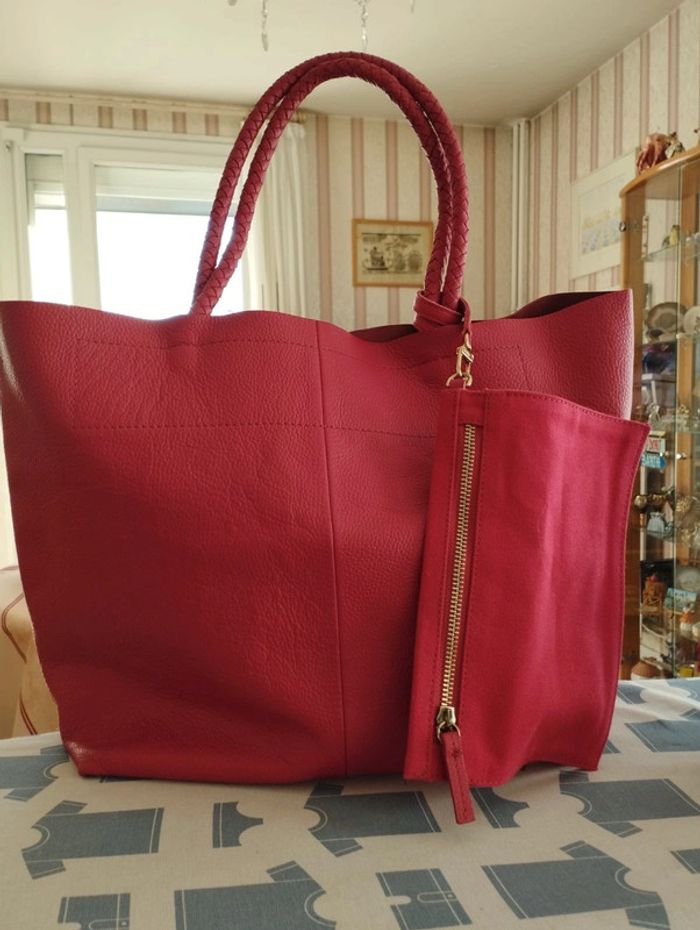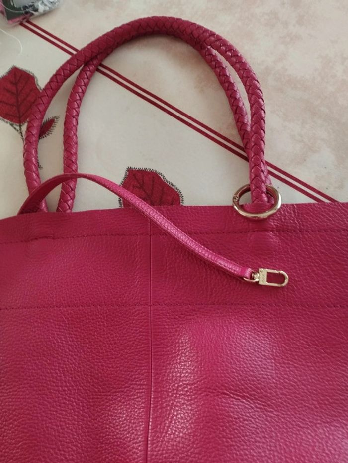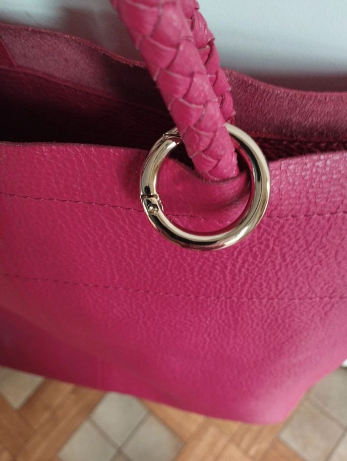 sac cabas en très bon état, en cuir rose avec saccoche - Attache-clés - Anses en cuir tressé - Porté main ou épaule Dimensions L 40 x H 33 x P 16 cm Anses 22 cm.