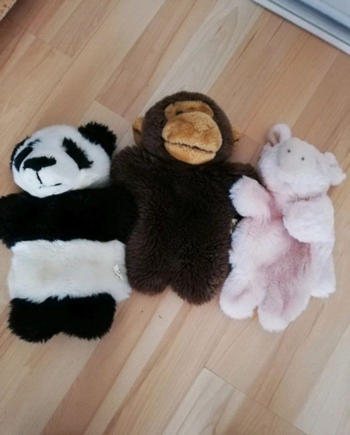 3 peluches marionnettes 1 cochon 1 singe 1 panda