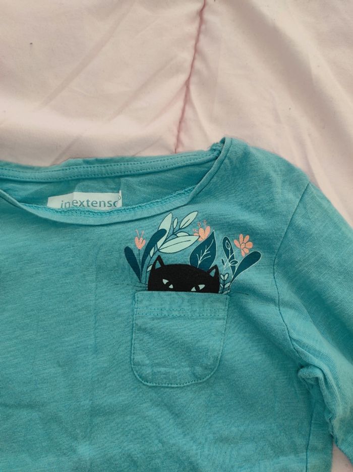 Turquoise tirant sur le vert. Poche poitrine avec imprimé. Bon état à très bon. #canelle0fille5ans