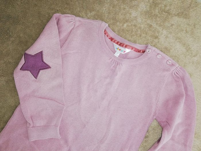 Pull rose violet avec patchs aux coudes. Taille indiquée 5 ans ou 110 cm ms peut convenir à un petit 6 ans. Bon état à très bon. #canelle0fille5ans #fille5ans #canelle0fille6ans #fille6ans