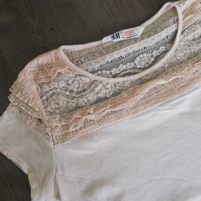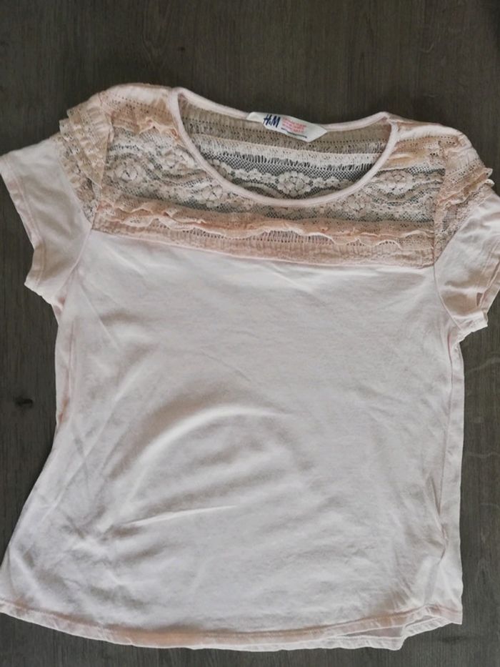 Tee-shirt rose saumon clair avec dentelle ajourée sur le haut devant et derrière ainsi que le haut des épaules. Base arrondie. Très bon état (peu porté). Taille indiquée 10/12 ans ou de 146 à 152 cm ms taille plutôt 10/11 ans sinon paraît court. #canelle0fille10ans #fille10ans