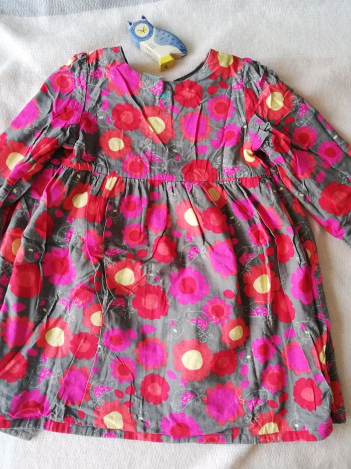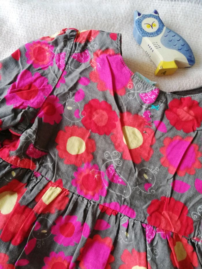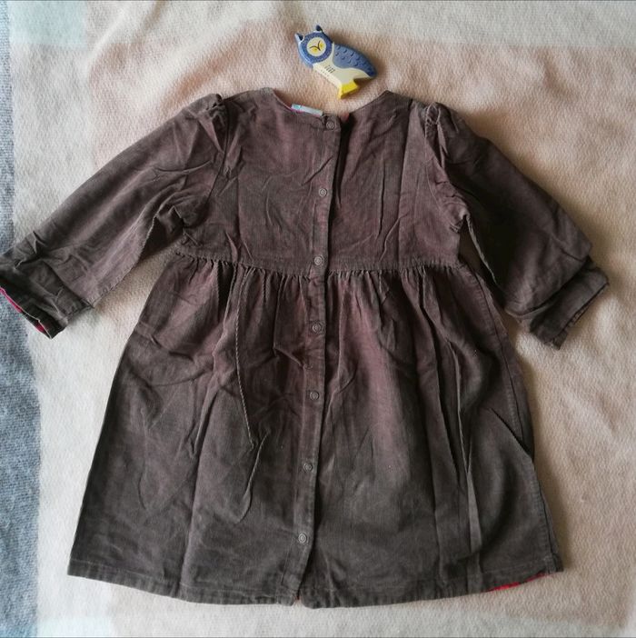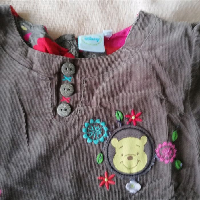 Robe d'hiver en velours maron avec patch Winnie L'ourson. Doublure fleurie tons rouges/roses. Boutonnage intégral du dos par pressions. Il est envisageable de la porter sur l'envers en décousant les étiquettes. Taille 36 mois. #canelle0fille3ans