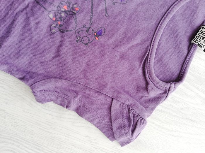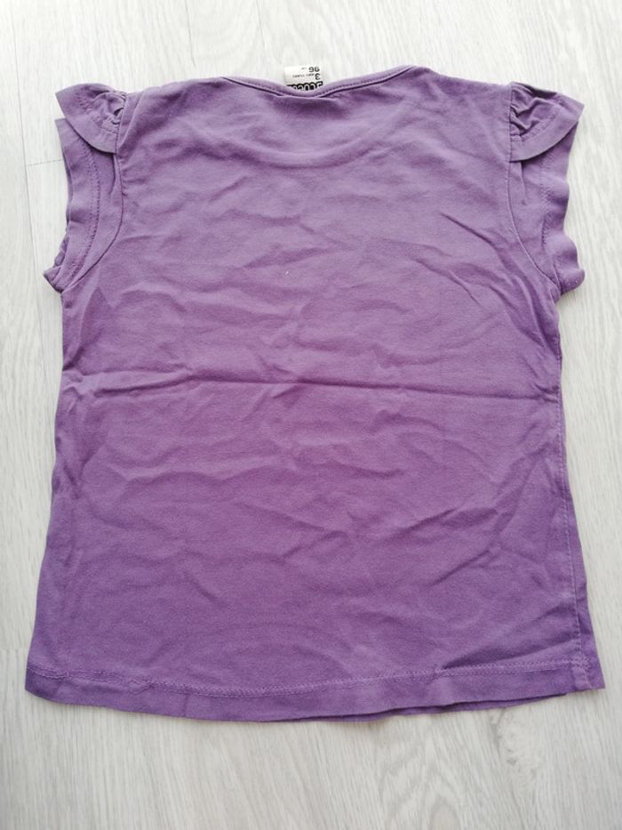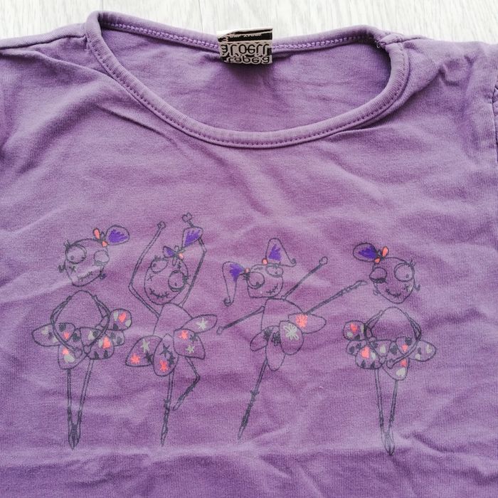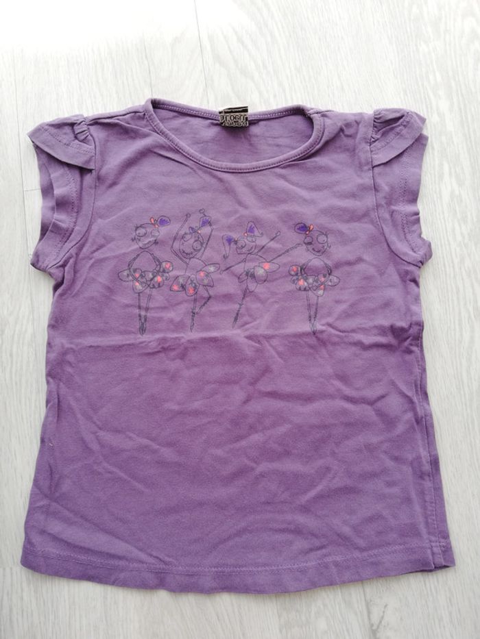 Tee-shirt manches courtes violet avec imprimé danseuses. Petit volant sur les manches. Taille 3 ans ou 96 cm. Bon état à très bon. #canelle0fille3ans #fille3ans