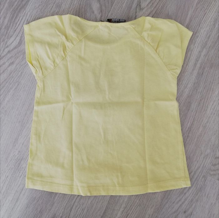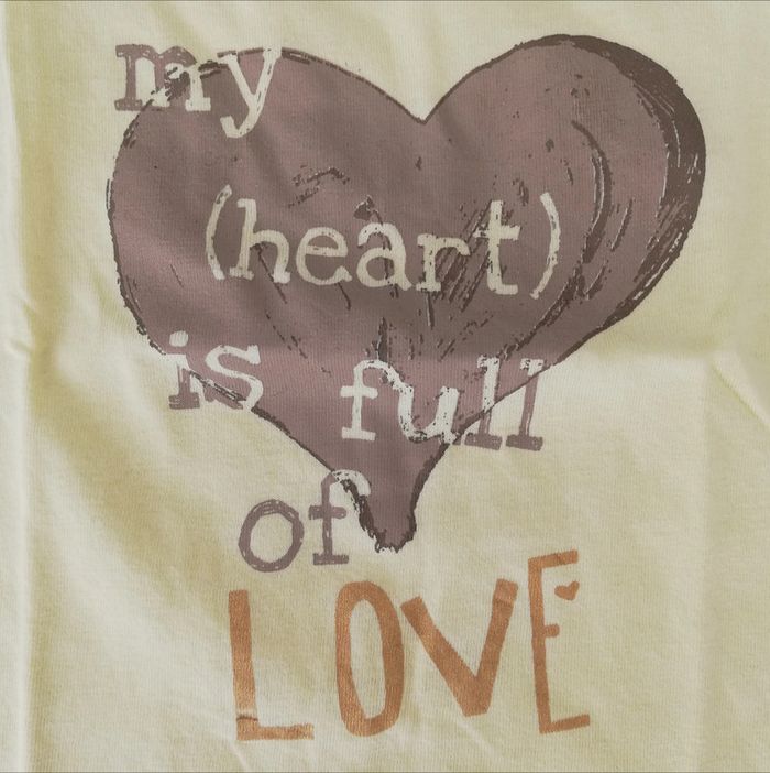 Tee-shirt manches courtes jaune avec imprimé cœur et inscription sur l'avant ton marron et doré. Taille 2 ans ou 86 cm. Très bon état. #canelle0fille2ans #fille2ans