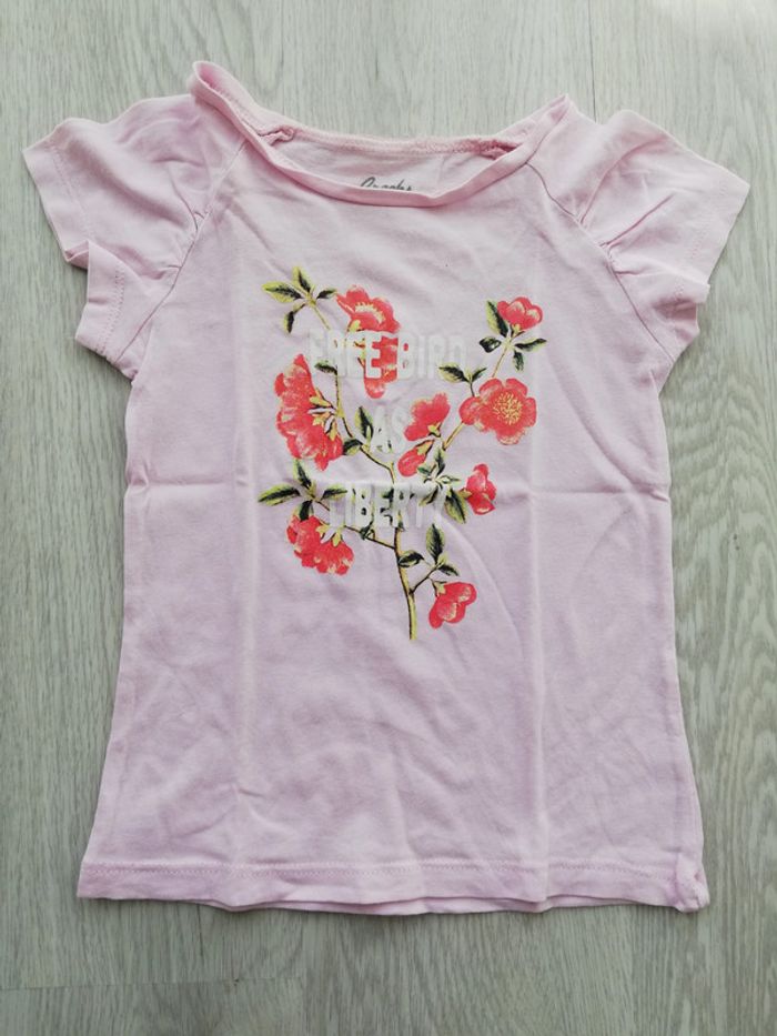 Tee-shirt manches courtes rose avec imprimé fleurs et inscription à l'avant. Taille 3 ans Marque Creeks vendue chez La Halle. Bon état à très bon. #canelle0fille3ans #fille3ans