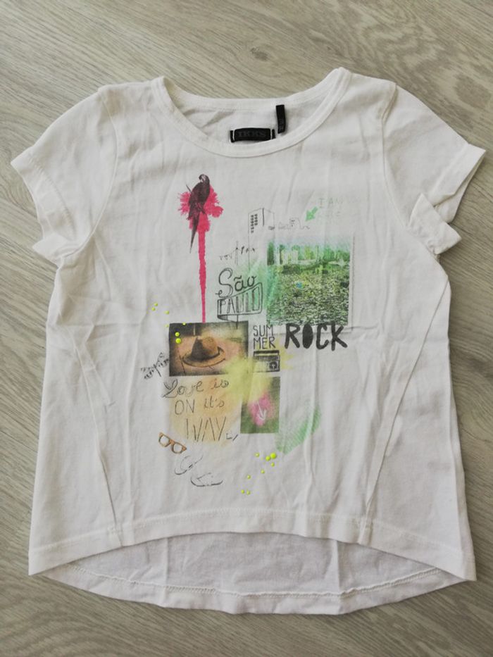 Tee-shirt manches courtes blanc avec imprimé et gouttes fluo en relief sur le devant. Découpe asymétrique entre devant et derrière. Taille 3 ans ou 94 cm Très bon état. #canelle0fille3ans #fille3ans