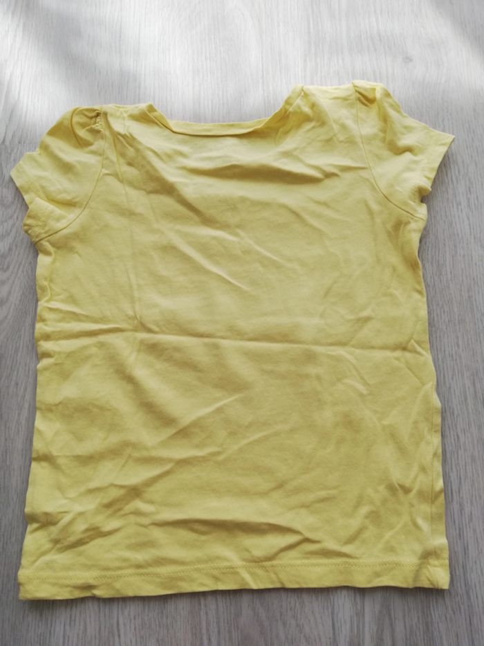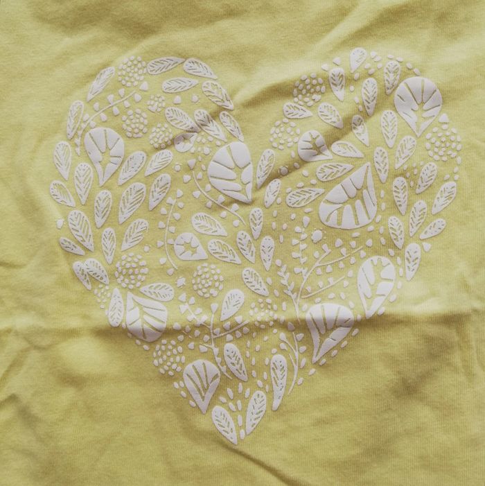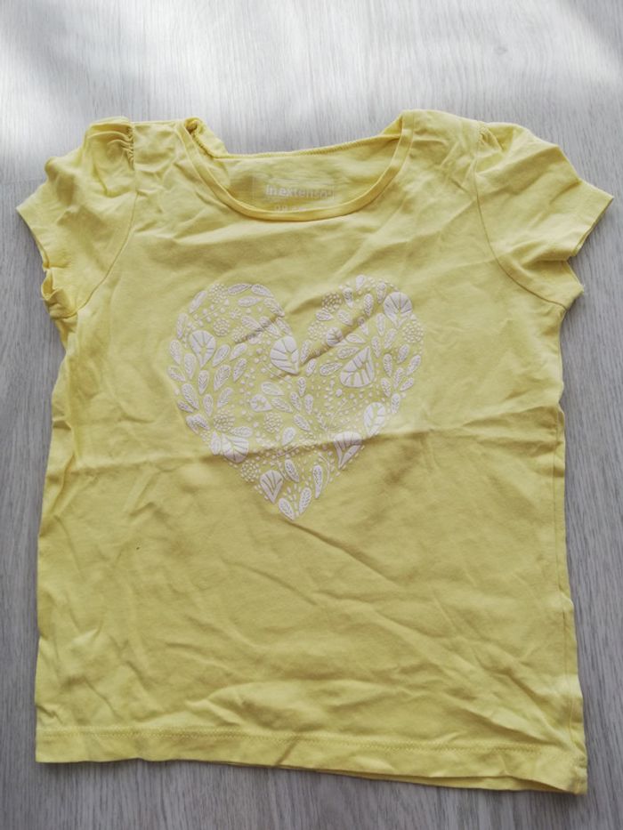 Tee-shirt manches courtes jaune avec flocage blanc qui forme un cœur. Taille 98 cm ce qui correspond a du 3 ans. Bon état à très bon. #canelle0fille3ans #fille3ans