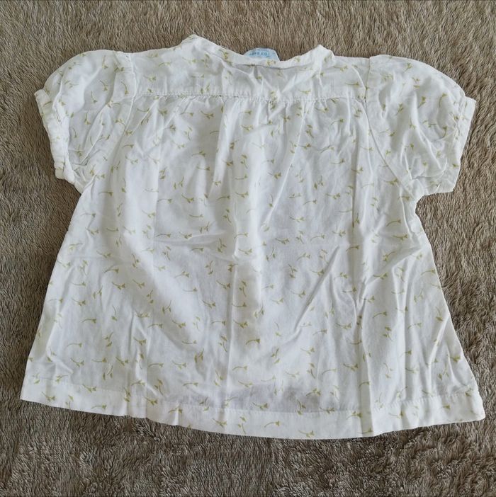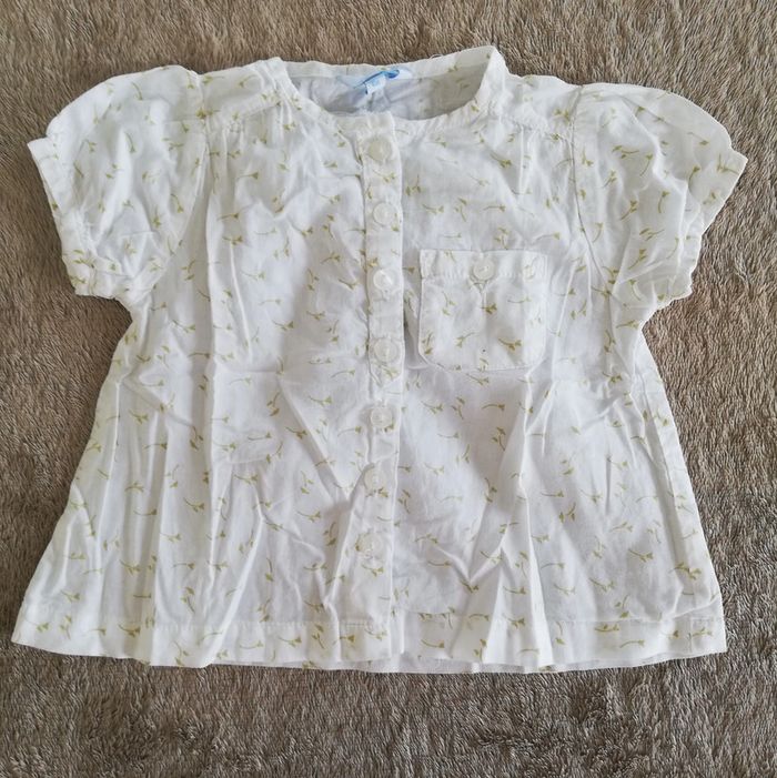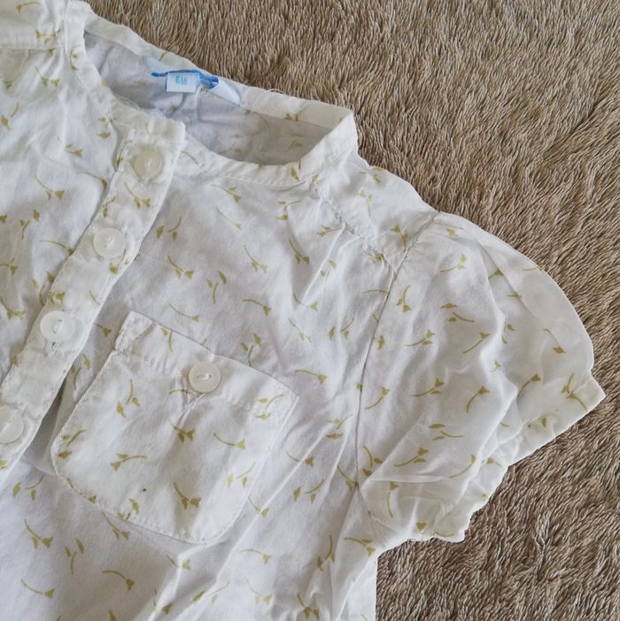 Chemisier à manches courtes ballons et petite poche poitrine. Blanc avec imprimé fleur vert anis. Taille 6 mois. Marque Tex pour carrefour. Très bon état. #canelle0fille6mois #fille6mois