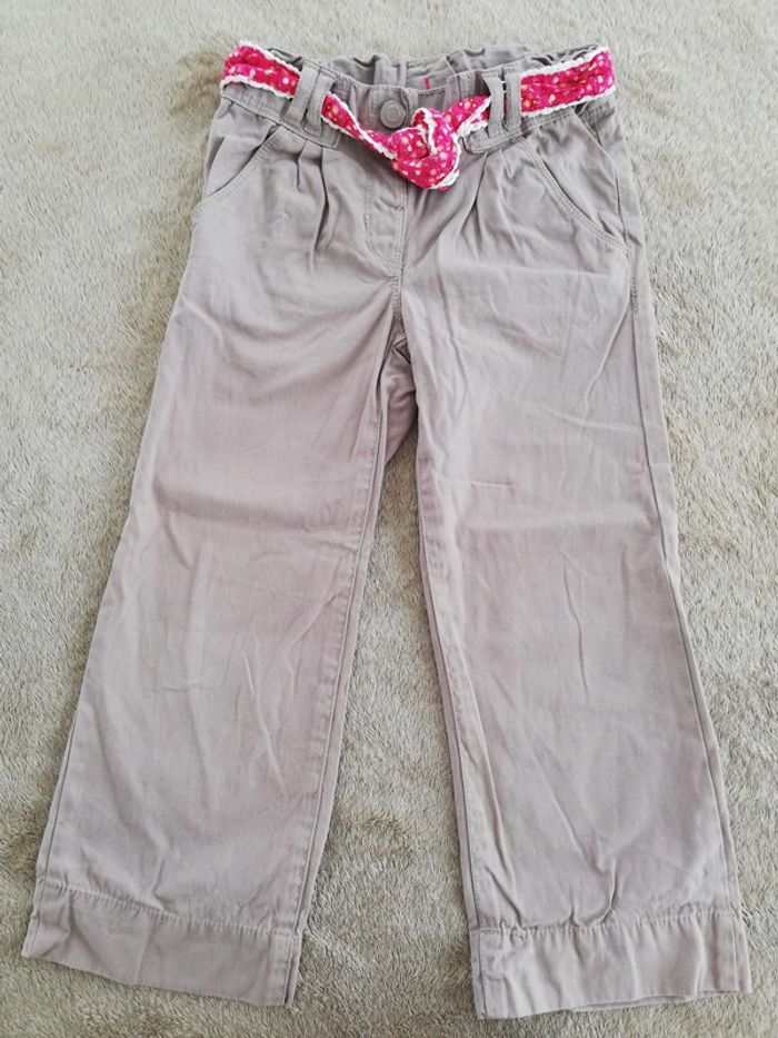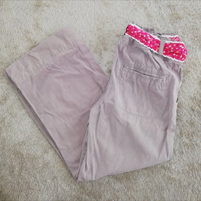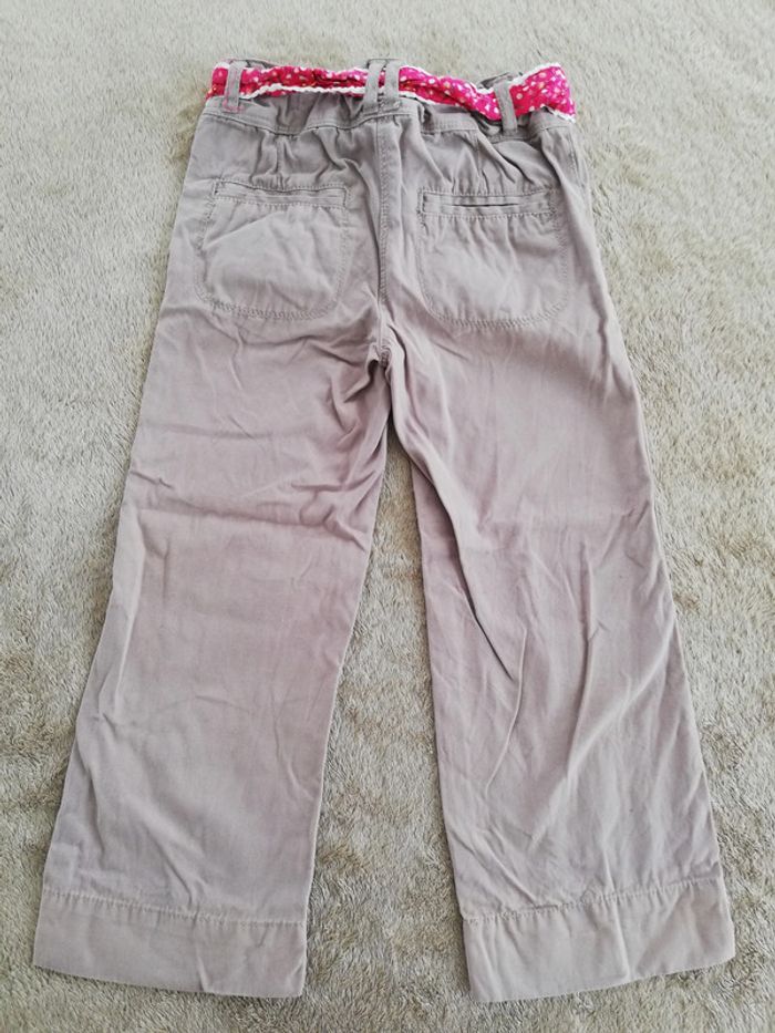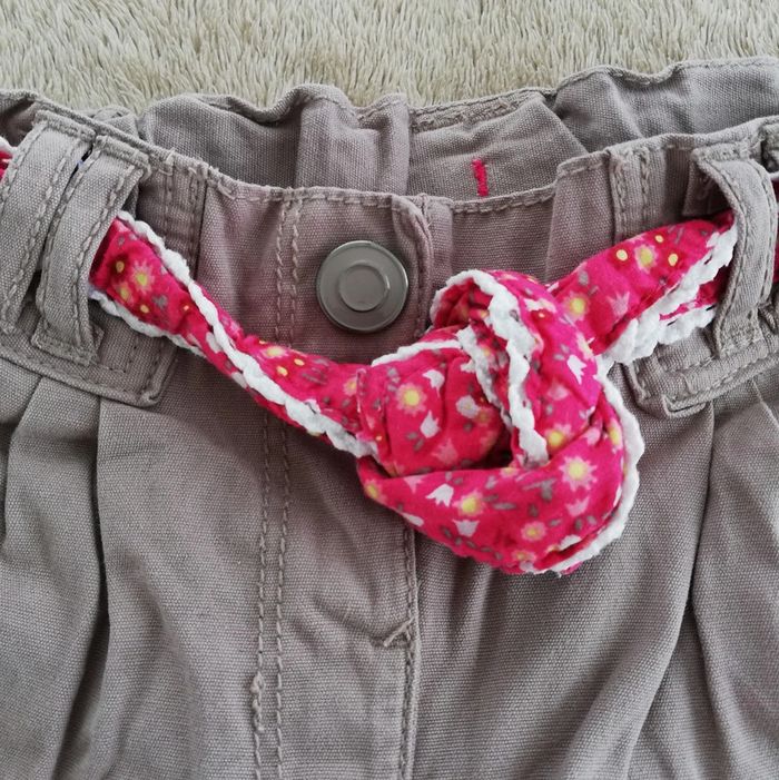 Pantalon marron large avec ceinture en tissu dans les tons rouges inamovible (1 point de couture au centre du dos). Taille 5 ans ou 110 cm. Très bon état (peu porté). #canelle0fille5ans #fille5ans