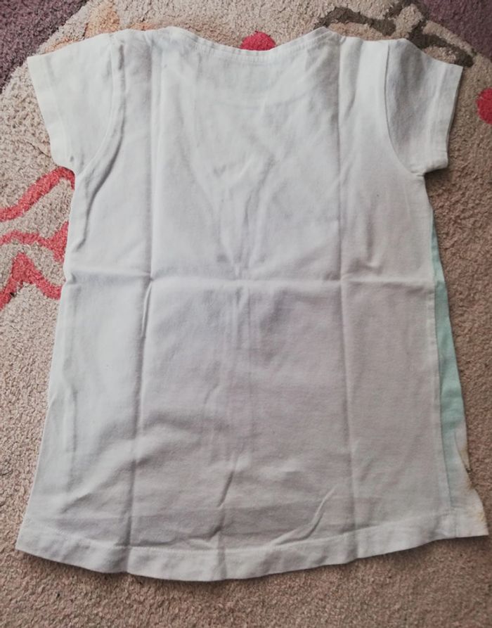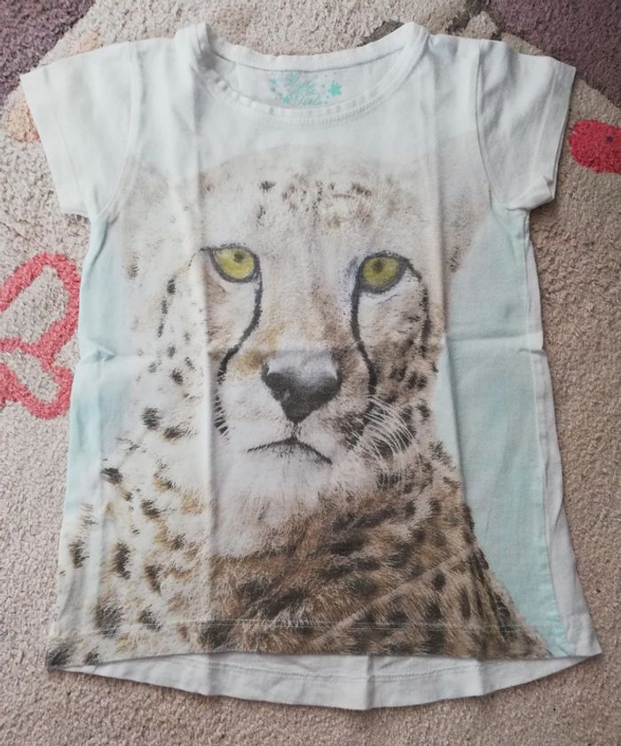 Tee-shirt manches courtes blanc avec imprimé léopard sur le devant. Asymétrique devant/derrière. Taille 5 ans. Bon état à très bon. #canelle0fille5ans #fille5ans
