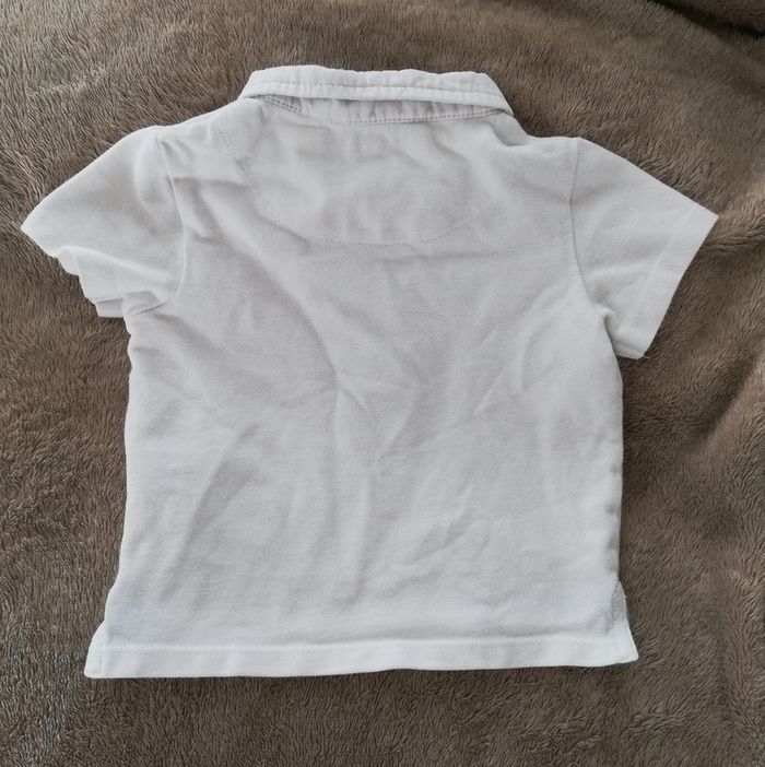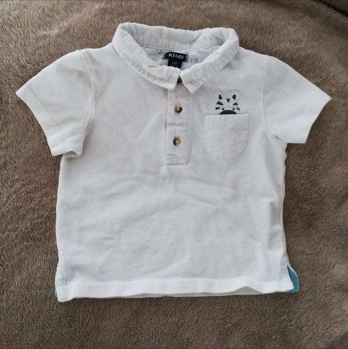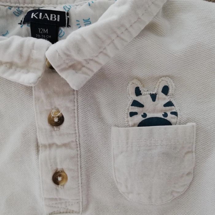 Polo blanc manches courtes avec petite poche sur la poitrine et patch zèbre bleu marine. Découpes latérales sur le bas avec doublure bleu ciel. Taille 12 mois ou de 73 à 76 cm (soit un bébé de 10 kg environ) Bon état à très bon. #canelle0garcon12mois #garcon12mois