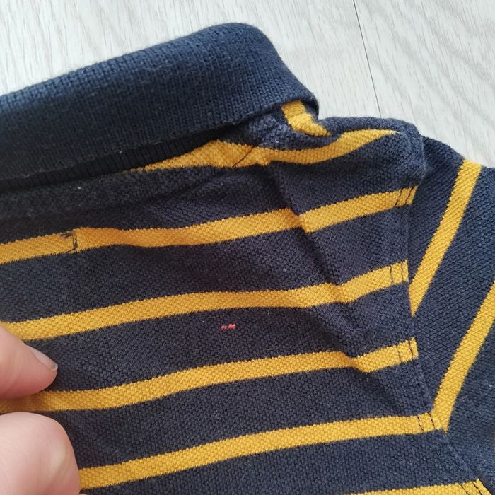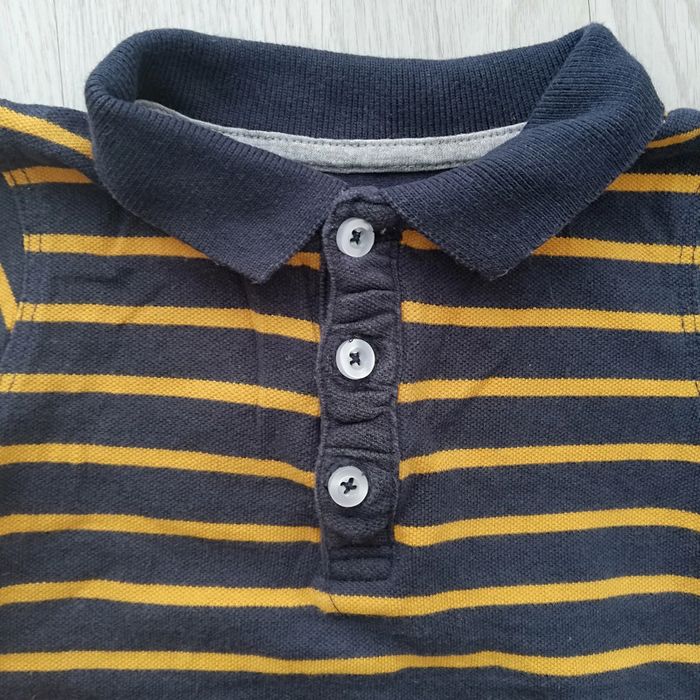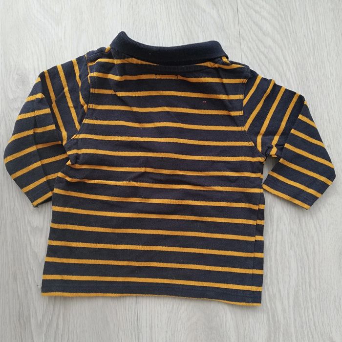 Polo manches longues rayé jaune moutarde et bleu marine. Petit défaut d'origine au dos (cf photo). Taille 12 mois ou de 73 à 76 cm (bébé d'environ 10 kg) Bon état. #canelle0garcon12mois #garcon12mois