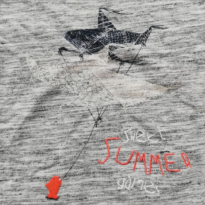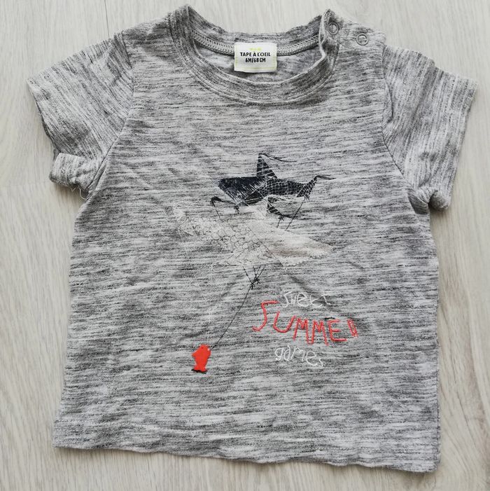 Tee-shirt été à manches courtes gris foncé chiné avec imprimé thème poissons/cerf-volants. Taille 6 mois ou 68 cm. Bon état à très bon. #canelle0garcon6mois #garcon6mois
