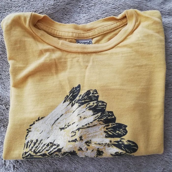 Tee-shirt jaune à manches longues avec imprimé coiffe d'indien noir et blanc sur le devant. Taille 2 ans ou 86cm. #canelle0garcon2ans #garcon2ans