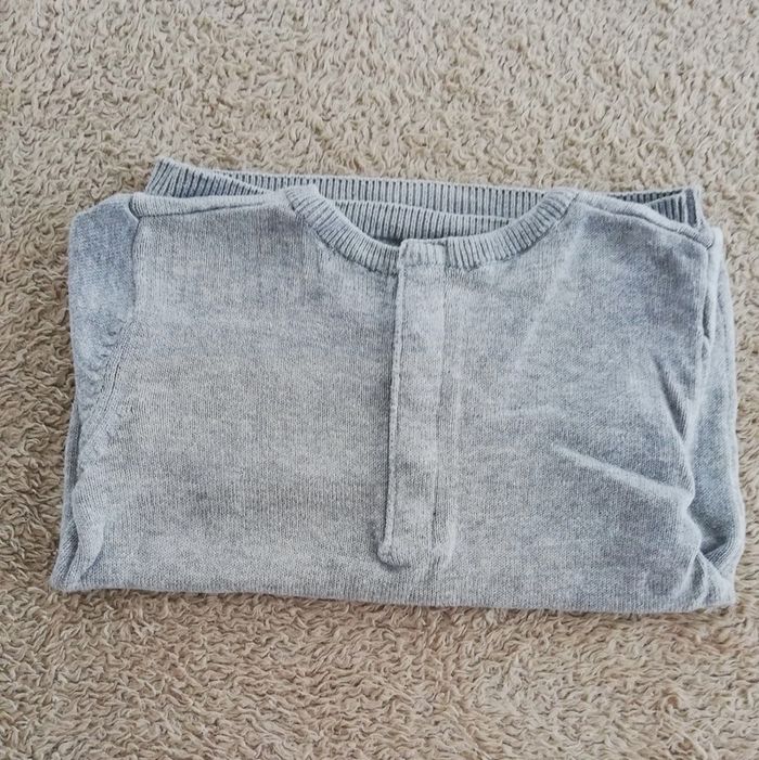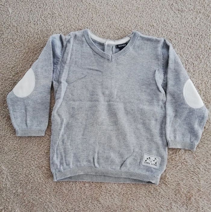 Pull fin gris avec coudières blanches. Col en V. Passage de la tête facilité par pressions dans le dos. Taille 12 mois ou de 73 à 76 cm. (ce qui correspond à un bébé de 10 kg environ) Très bon état. #canelle0garcon12mois #garcon12mois