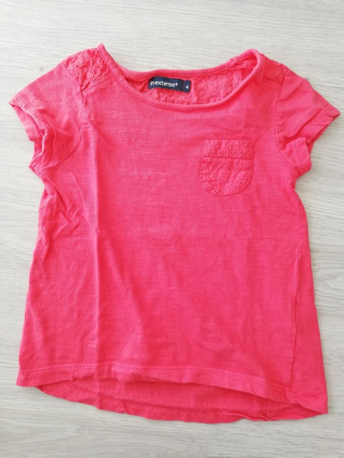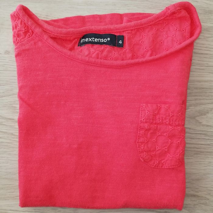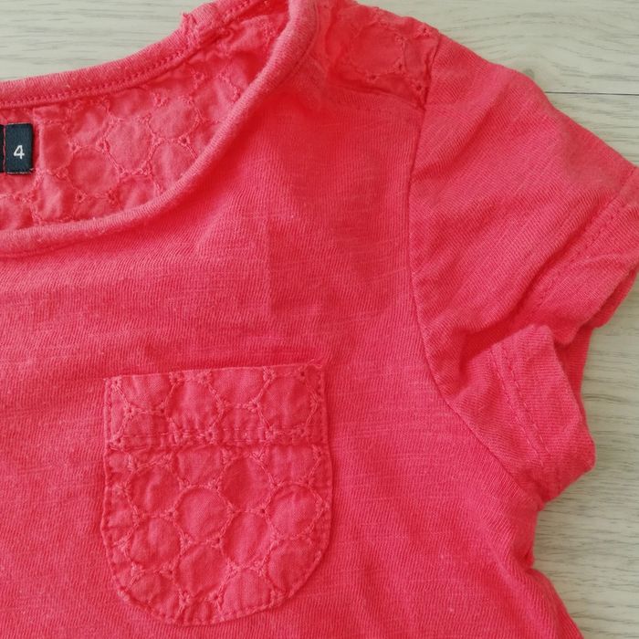 Tee-shirt rouge rosé à manches courtes avec empiècements épaules, nuque et poches devant en tissus style dentelle anglaise. Légèrement asymétrique devent/derrière. Bon état à très bon. Taille 4 ans. #canelle0fille4ans #fille4ans
