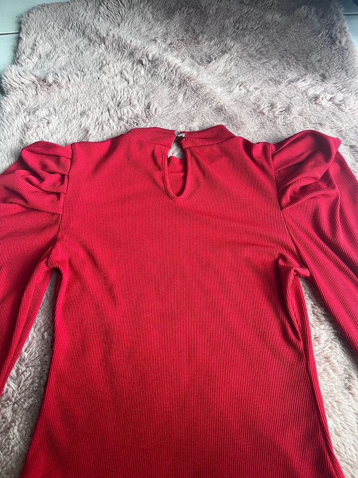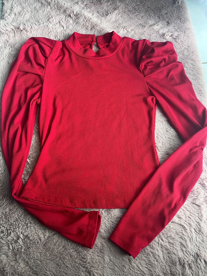 Bonjour vends joli haut rouge avec épaules bouffantes . Bouton derrière pour fermer . Très bon état