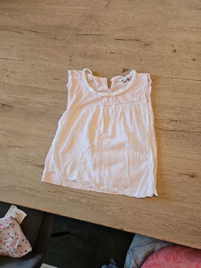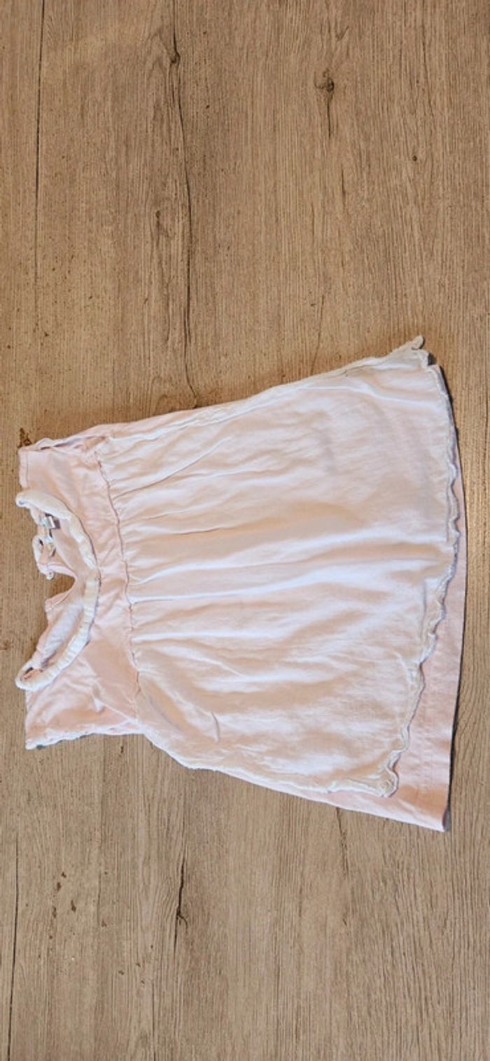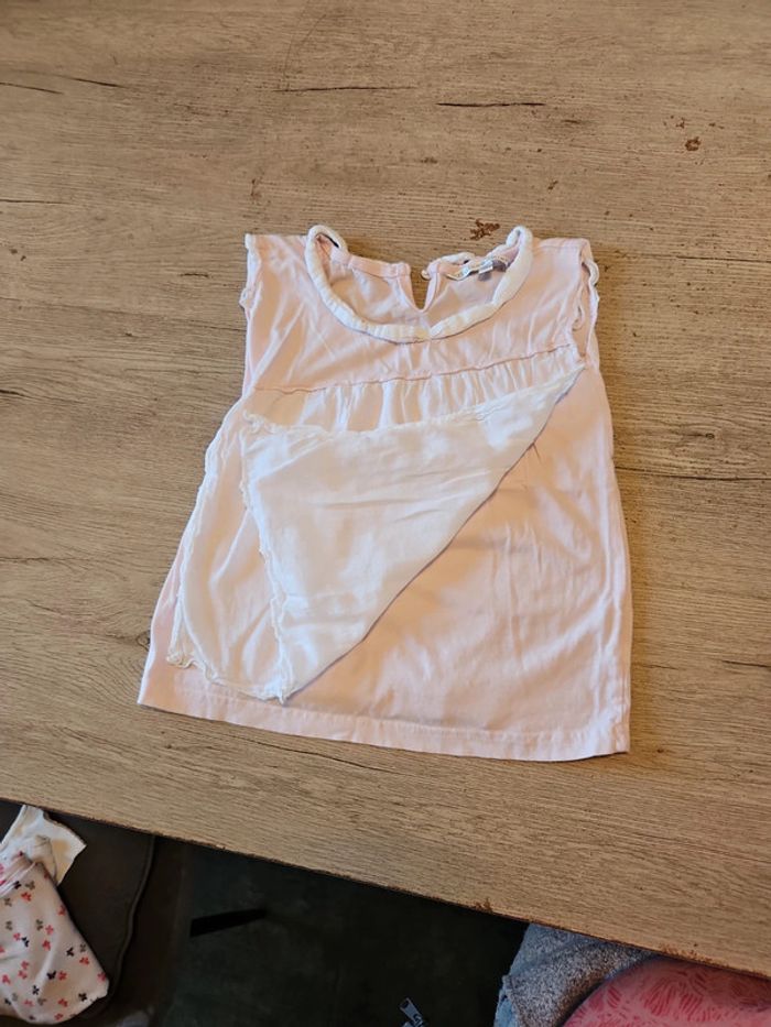 Jolie blouse pour fille qui convient pour du 5 à 6 ans. Mise quelques minutes pour des photos puis lavée. Elle est rose très clair avec un col blanc et comme 1 tablier blanc devant. Très original. Se ferme par un bouton dans le dos. Sans manche #deborahtock_6ans
