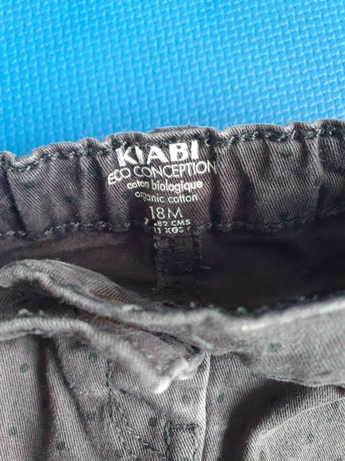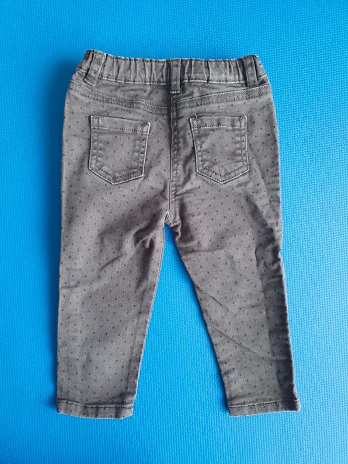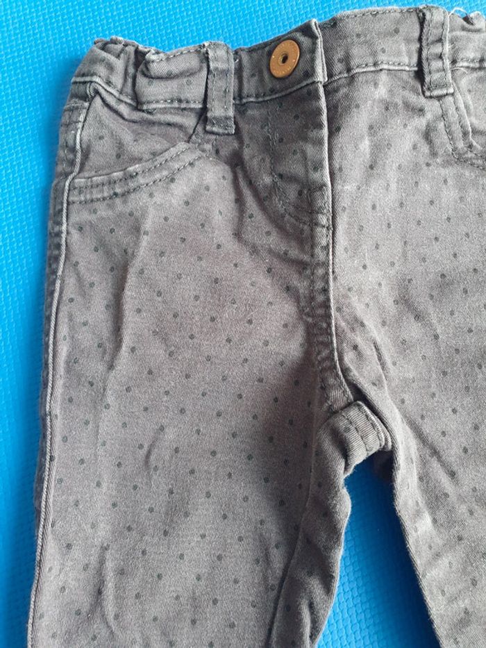 Pantalon gris un peu plus foncé que sur les photos. Motif pois. Taille élastiquée.
