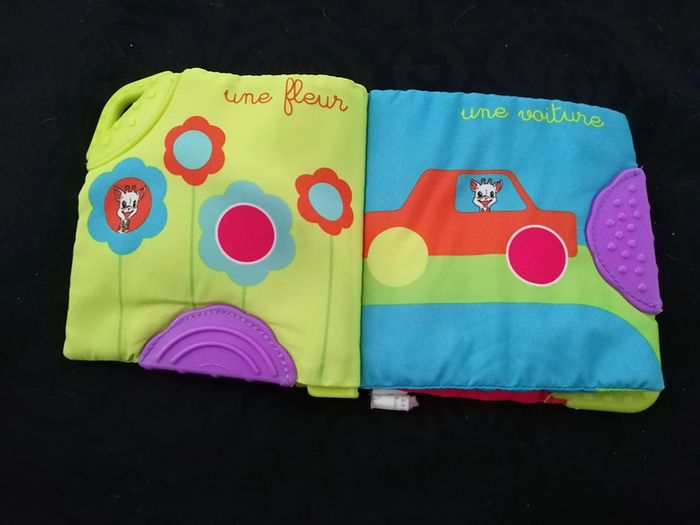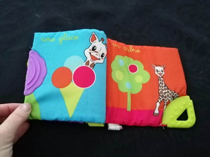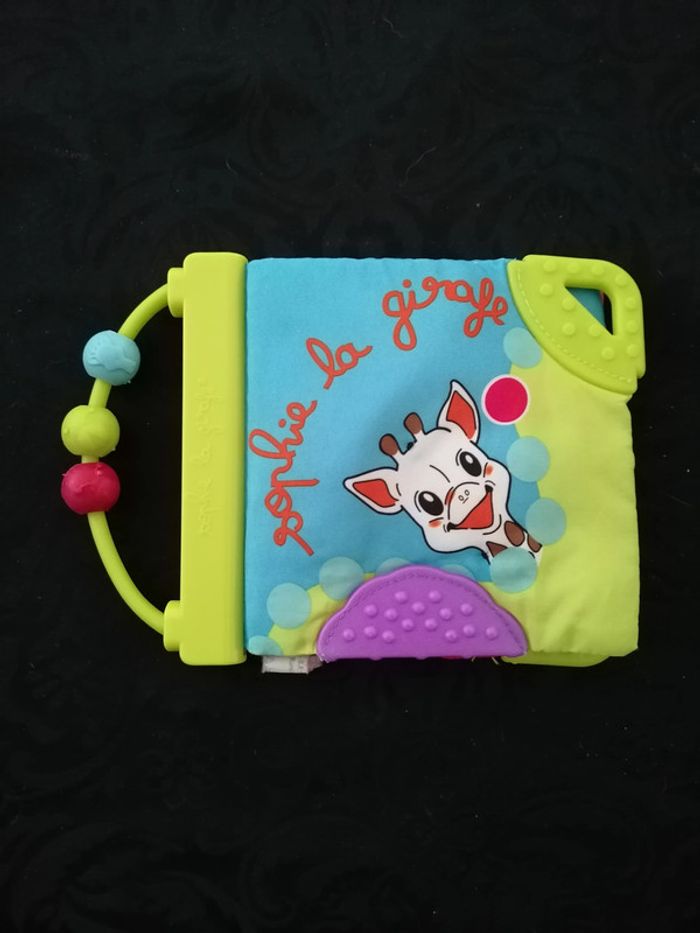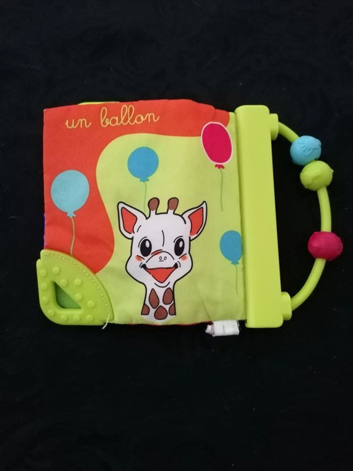 Livre en tissus Sophie la girafe vulli Papier qui bruise, parties silicone, boules colorées