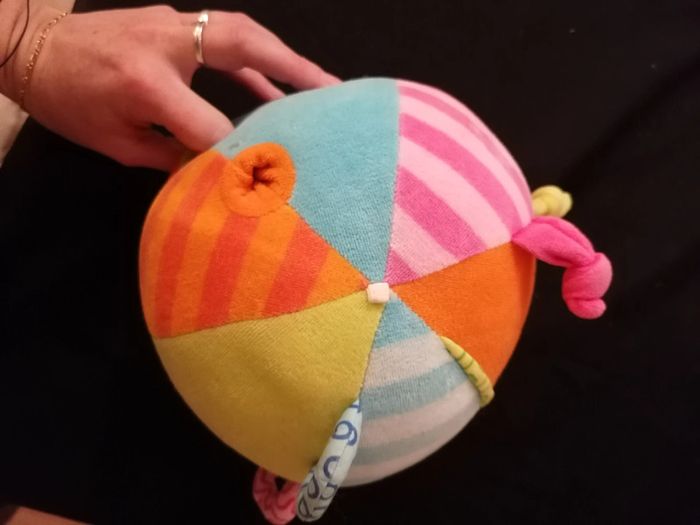 Balle d'éveil en tissu baby sun 20cm de diamètre Trous, anneaux, nœuds, couleurs, pour éveiller bébé