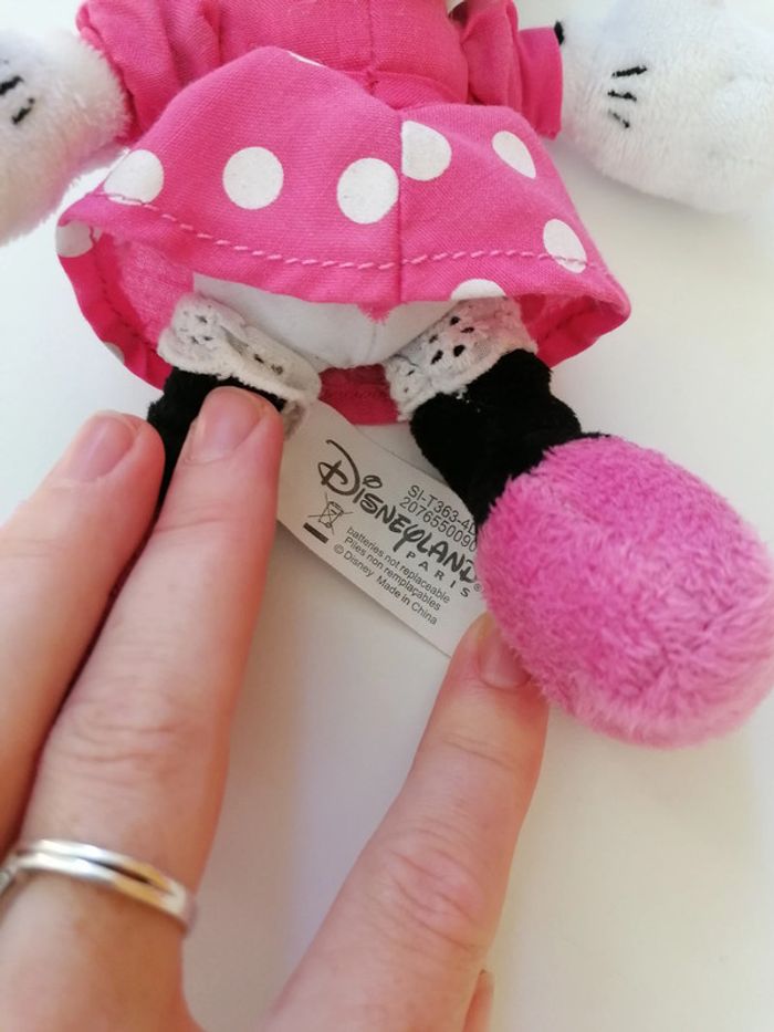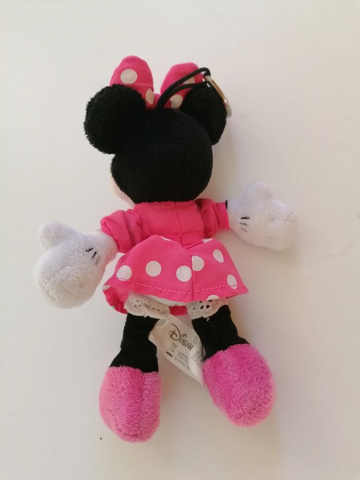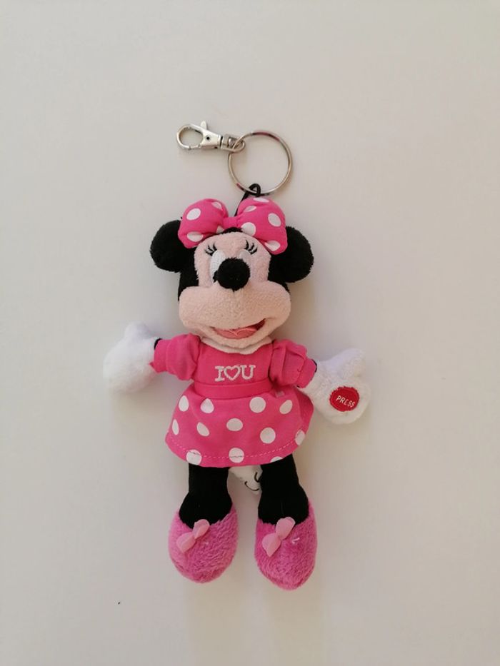 Porte-clé peluche minnie Disneyland paris Ne fait plus de bruit mais pas de possibilité de changer les piles 🙄 En très bon état Environ 18cm de long