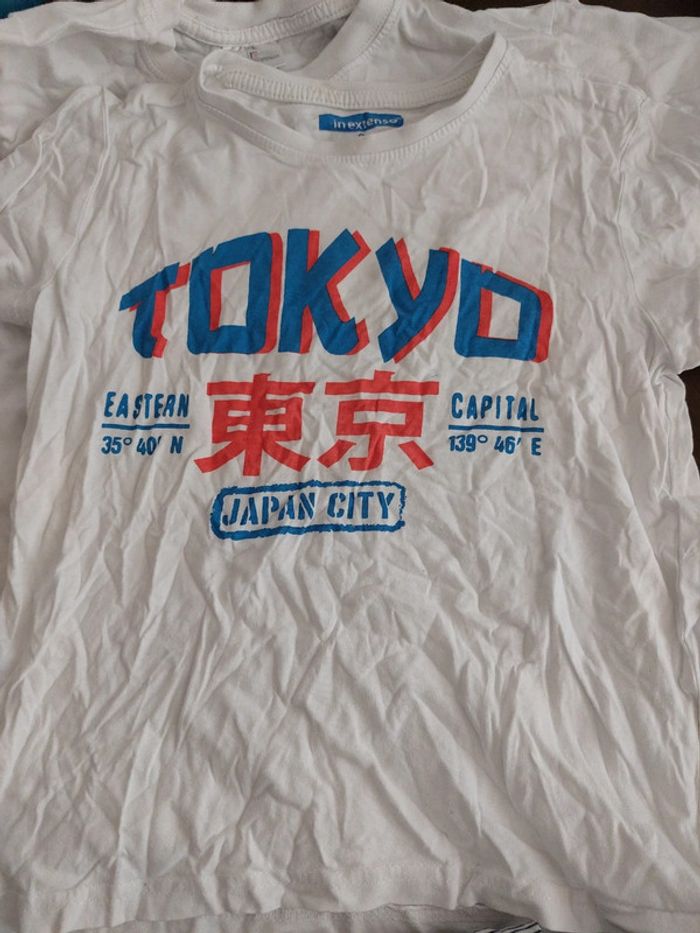 2 t-shirts Taille 8ans Le rayé kiabi (porté 1 fois) Le blanc in extenso Donne avec un t-shirt ligue de Tennis taille 8 ans (taille grand) car il a une petite tâche voir photo)