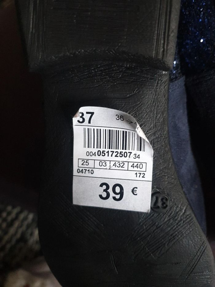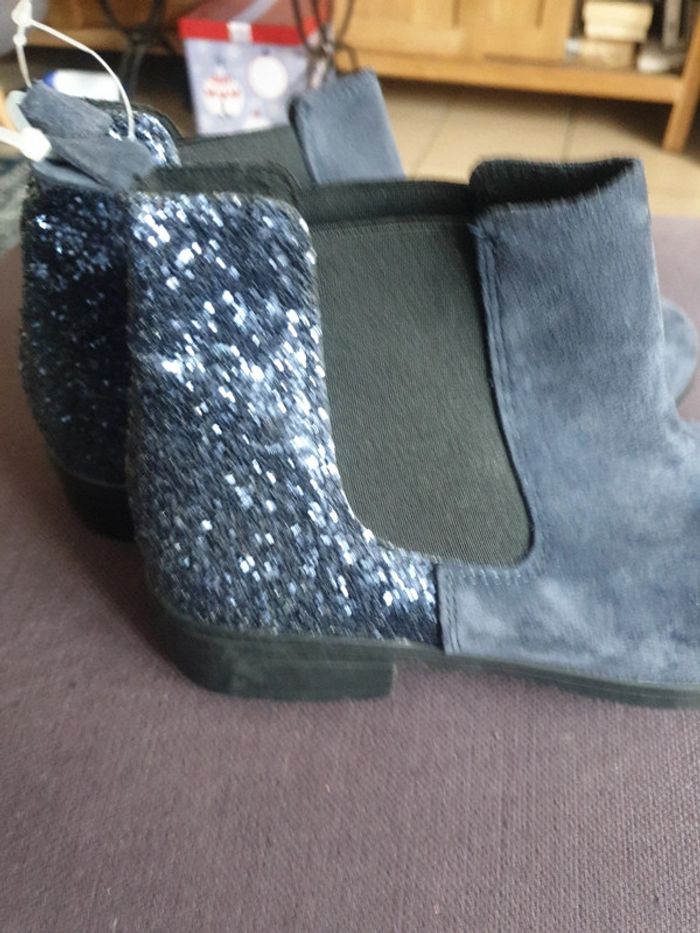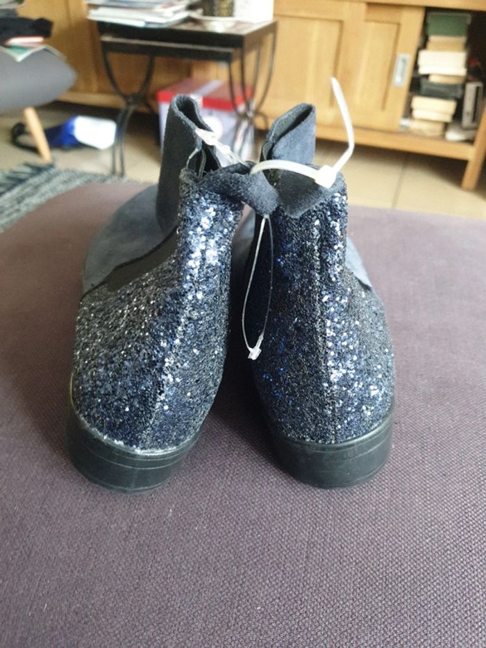 Bottines neuves jamais portées. Envoi tout transporteur sauf vinted go! Dessus croute de cuir sauf parties brillante pailletée à l'arrière de la chaussure Semelle intérieure cuir Élastiquée sur les côtés Taille 37. La halle Valeur 39€. Vendu 20 euros