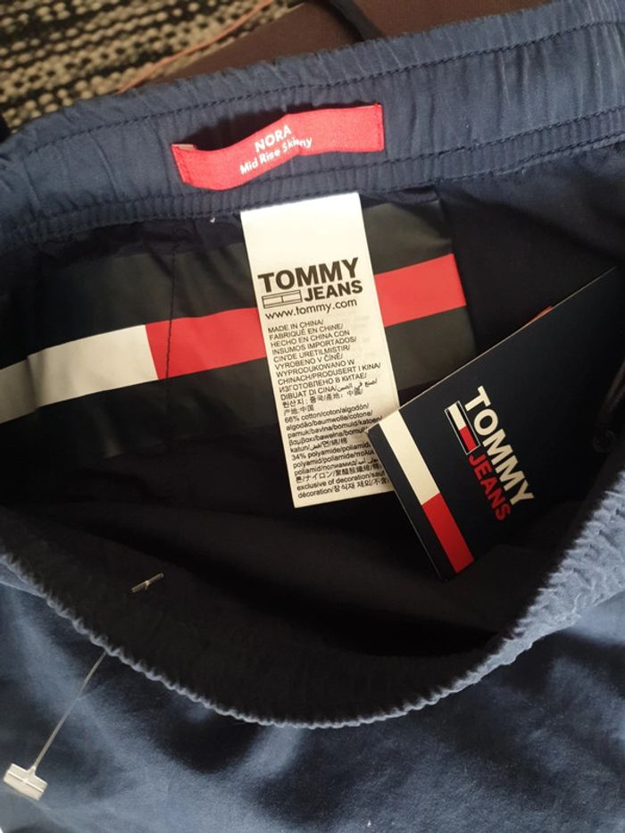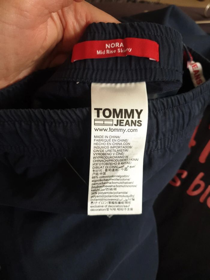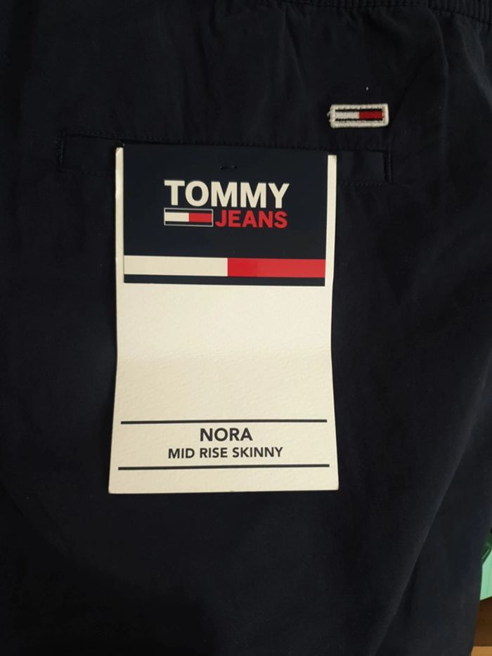 Modèle mid rise skinny. Elastiqué à la taille. Large galon côté avec inscription Tommy jeans. 66 % coton 34 % polyamide Taille XL .