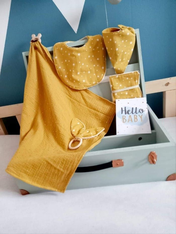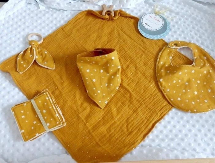 Bonjour, Je fabrique une boîte box composé de : - 1 lange personnalisé - 1 bavoir avec pression - des lingettes Lavables - 1 hochet de dentition en bois et tissus - 1 bandana N’hésitez pas a me contacter si vous avez besoin de renseignements