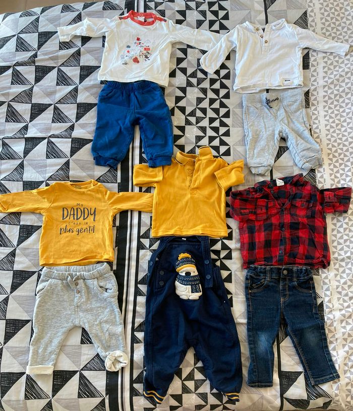 bonjour je vends un lot de vêtements taille 9 mois neuf et très bon état ⚠️ Possibilité de dissoudre le lot, d’acheter à l’unité, ou bien même d’ inclure dans un autre lot Articles lavés, possibilité de repassage sur demande⚠️ - 1 salopette molletonnée + t shirt manches longues épais collection carrfour - 1 jean Kiabi + 1 chemise h&m - 1 jogging h&m + 1 t shirt manches longues Kiabi - 1 jogging tex + 1 t shirt manches longues sergent major - 1 pantalon gémo + 1 t shirt manches longues kiabi