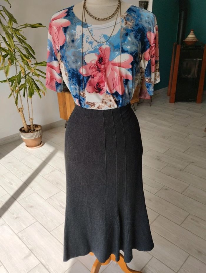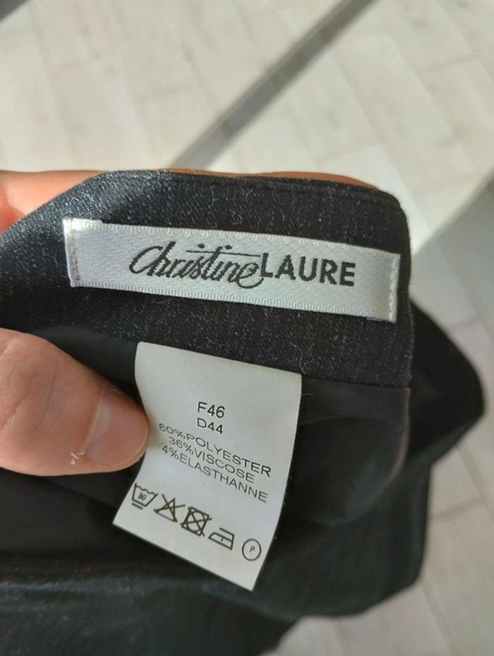 Magnifique jupe longue de la marque Christine Laure en taille 46 La jupe est en parfait état avec doublure intérieure 4 % d'elastane , couleur gris anthracite Évasée dans le bas Longueur 79cm