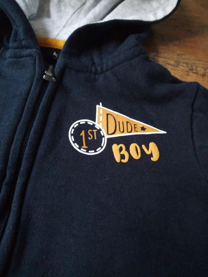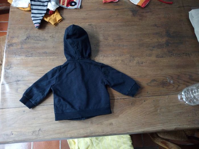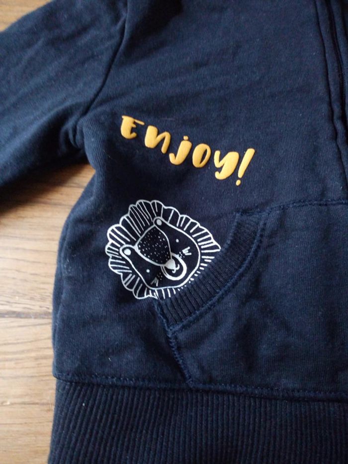 Vend une veste a capuche Très peu portée Couleur bleu marine inscription jaune tête de lion Fermeture éclair deux poches #stef62180_sixmois