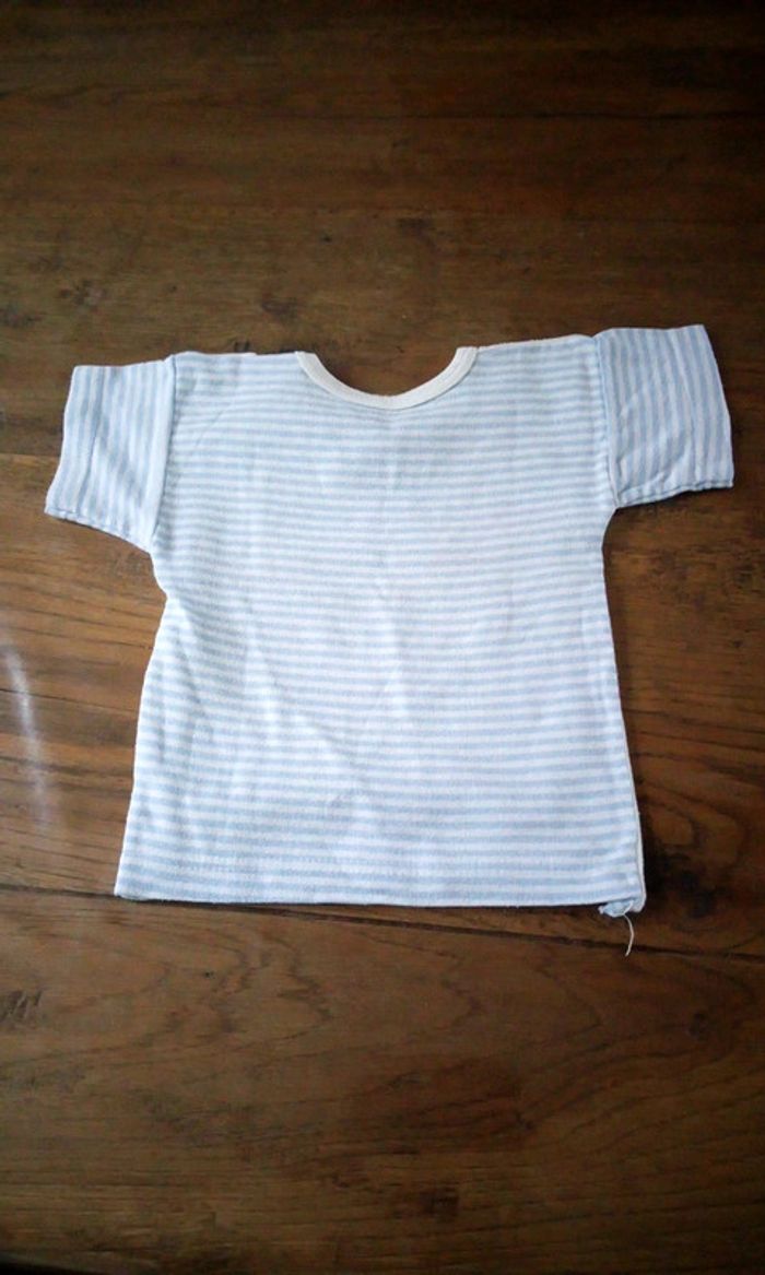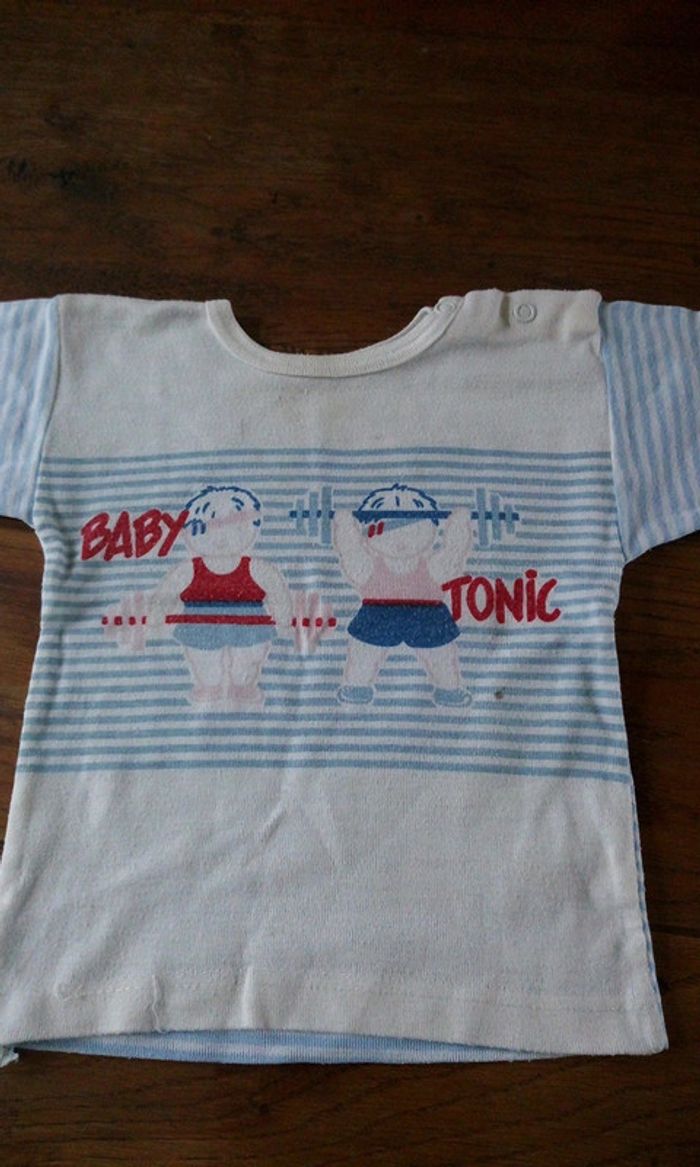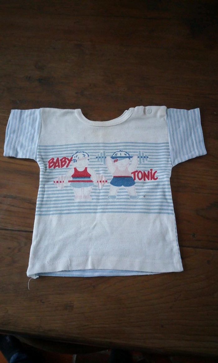 Vend un tee-shirt Couleur blanc et bleu rayé Baby tonic Une tâche sur l'avant Je ne suis pas sur de la taille Dimensions : longueur totale 30 cm - largeur sous aisselles 25 cm ancien rétro vintage #stef62180_vintage #stef62180_douzemois