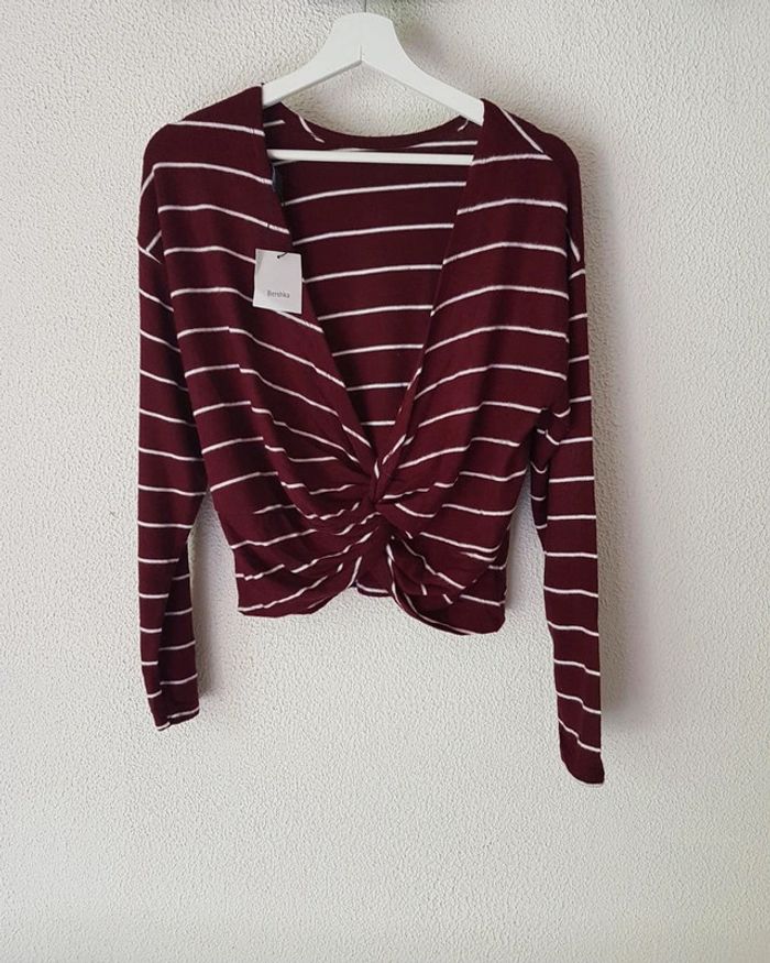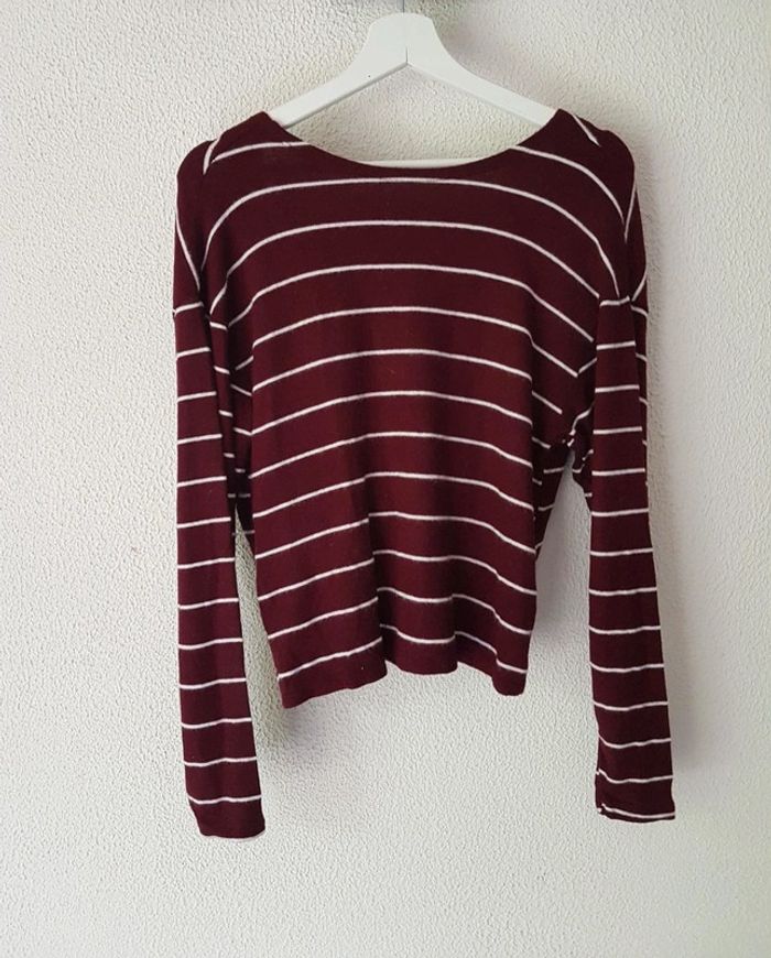 Haut manches longues bordeaux à rayures blanche de la marque Bershka Ouvert dans sur une partie du dos En voir plus : #Fannydsntaille34XS #Fannydsnhauts