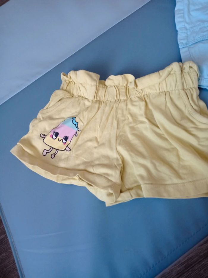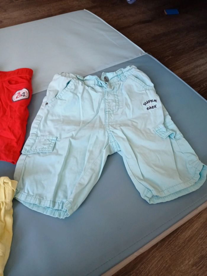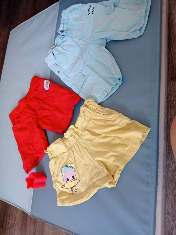 Un rouge grain de blé 18 mois. Une toute petite tâche derrière. Ça ne se voit pas trop. Un short jaune mis deux fois 1 1/2-2 ans. H&M. Un short bleu 18 mois orchestra en très bon état. Le lot 2 euros