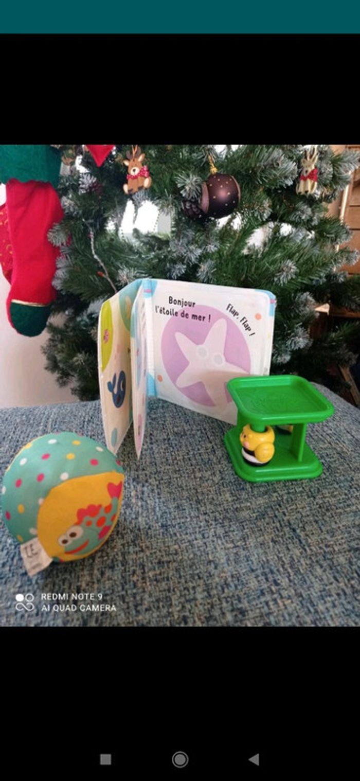 Un livre pour la bain. Les personnages changent de couleur dans l'eau. Un jeu miroir avec une petite abeille 🐝 qui bouge quand on secoue Une balle toute molle pour attraper et pourquoi pas la lancer Jeu en parfait état 🎄🎁